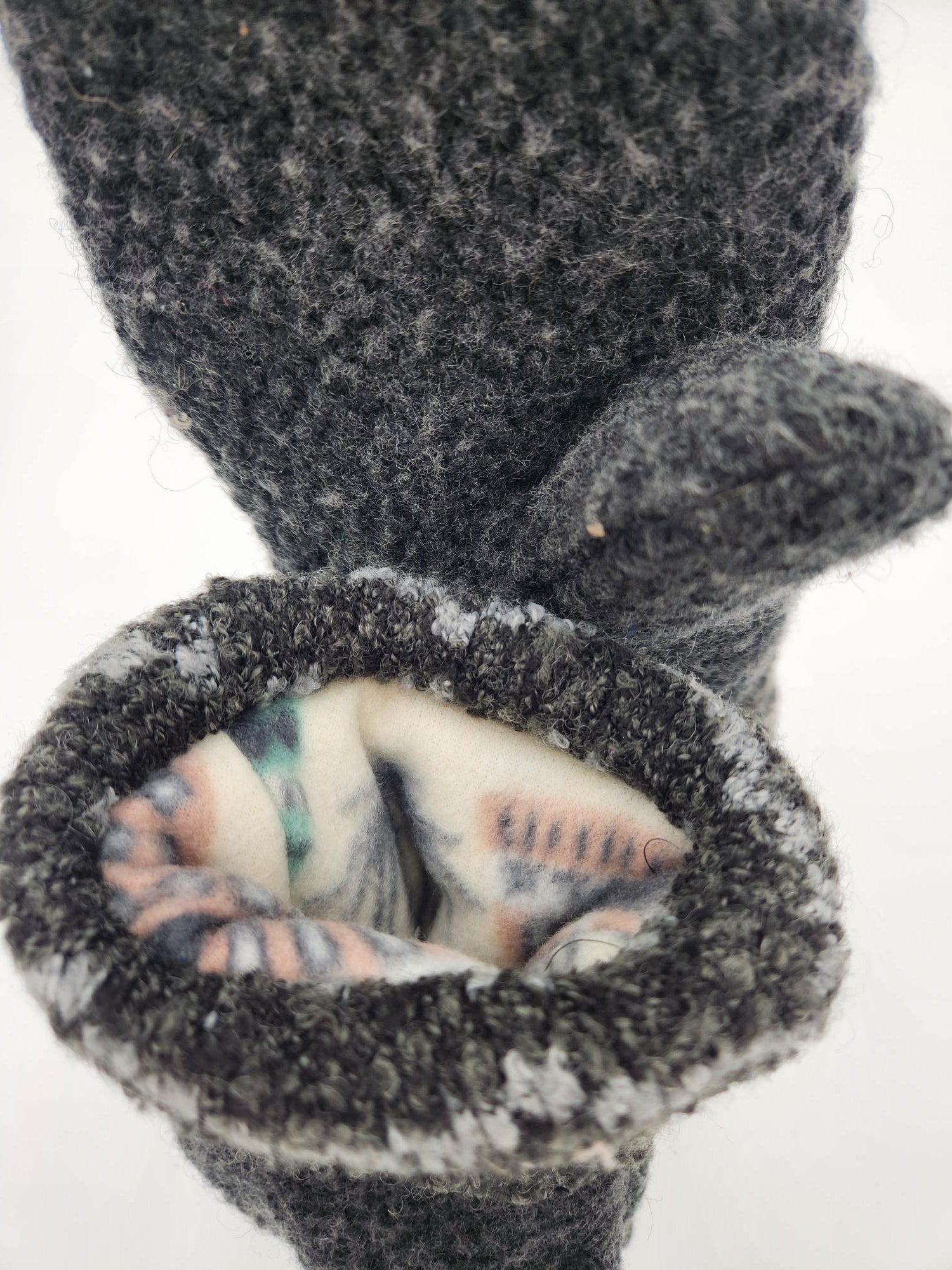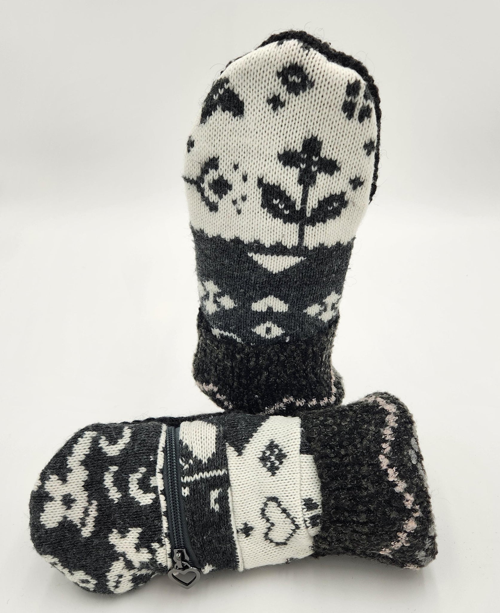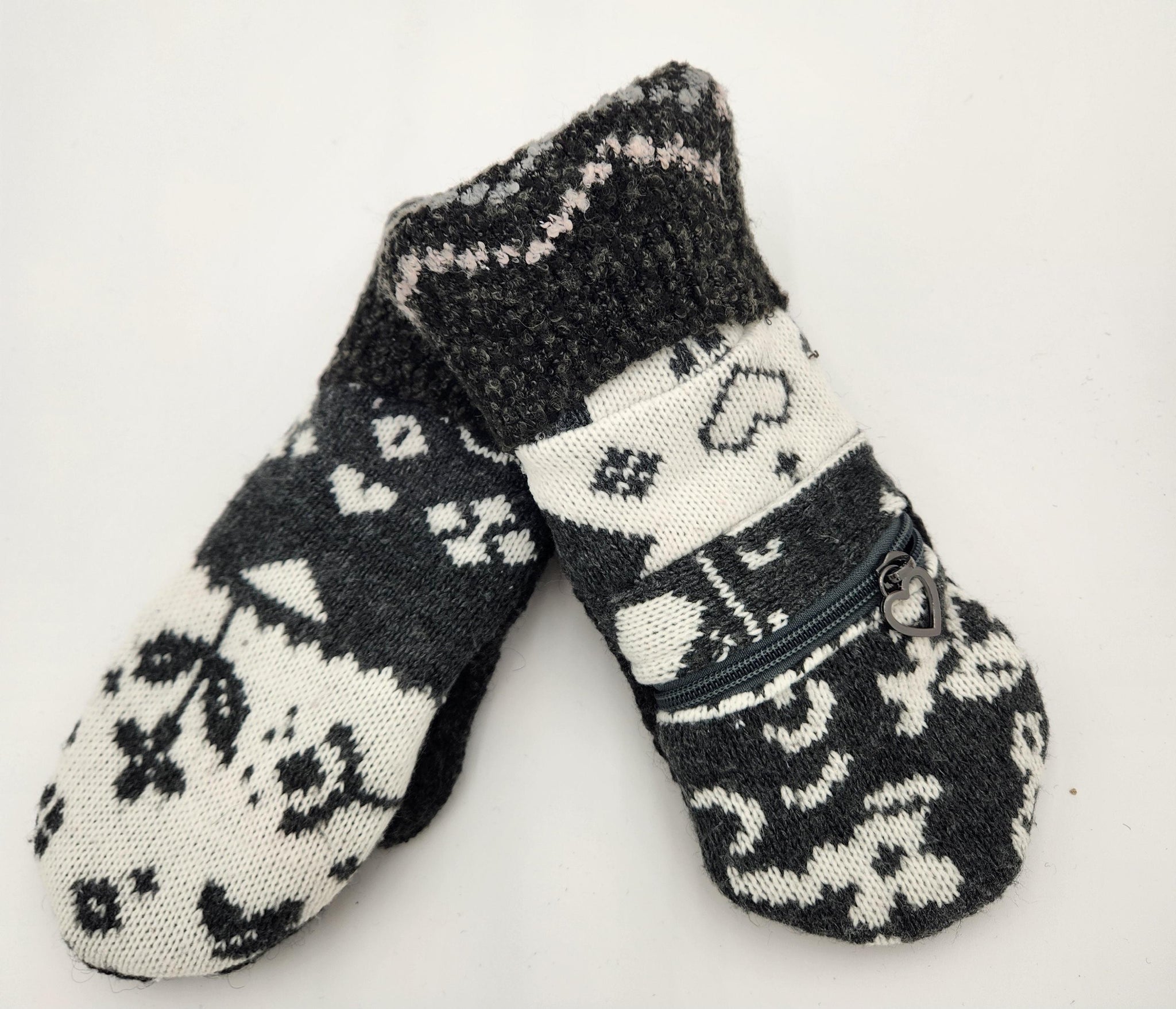 These cozy mittens are handmade from repurposed fabrics, making them both eco-friendly and stylish. The design features a functional zipper pocket, perfect for tucking away small essentials like lip balm or a key. Fully lined for extra warmth, these mittens blend practicality with charm, keeping your hands toasty while adding a rustic, one-of-a-kind touch to your winter wardrobe. Made by Josie T. Designs