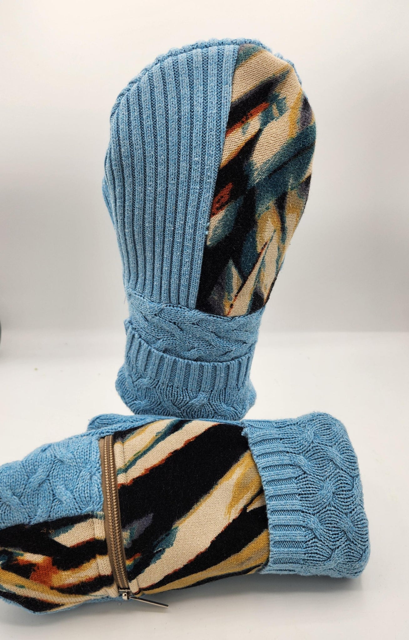 These cozy mittens are handmade from repurposed fabrics, making them both eco-friendly and stylish. The design features a functional zipper pocket, perfect for tucking away small essentials like lip balm or a key. Fully lined for extra warmth, these mittens blend practicality with charm, keeping your hands toasty while adding a rustic, one-of-a-kind touch to your winter wardrobe. Made by Josie T. Designs