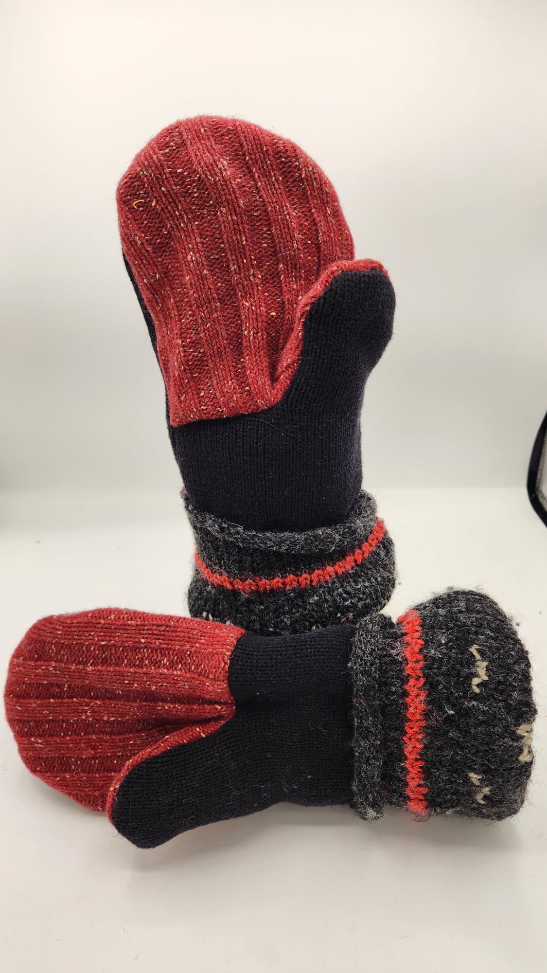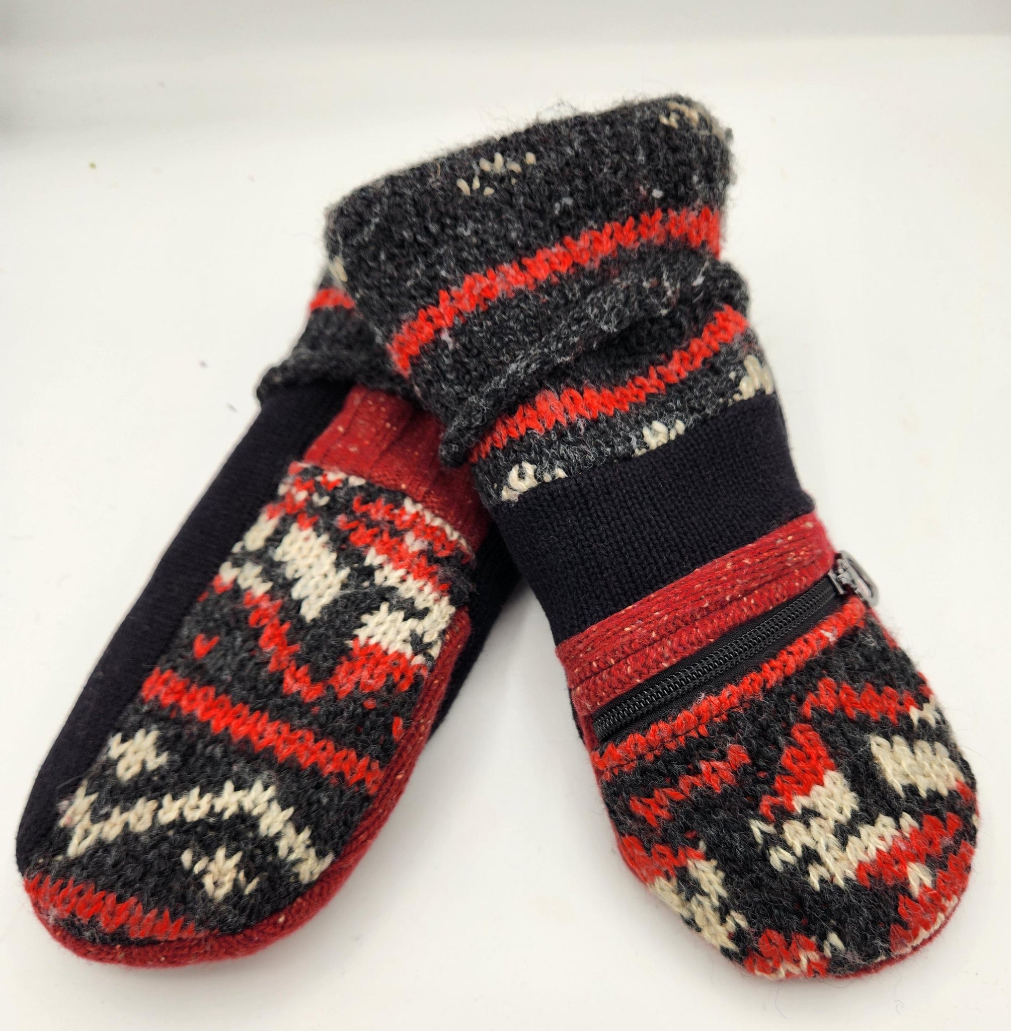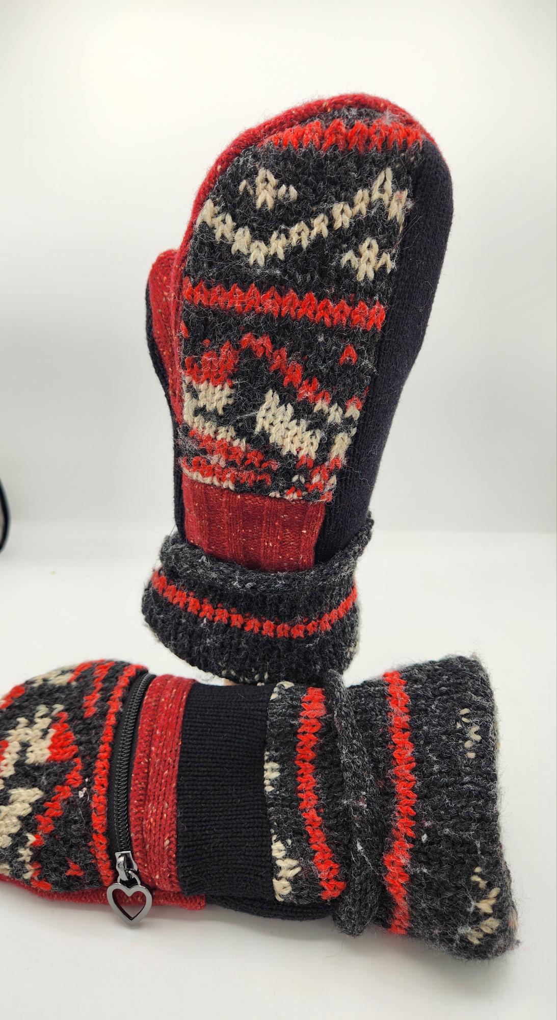 These cozy mittens are handmade from repurposed fabrics, making them both eco-friendly and stylish. The design features a functional zipper pocket, perfect for tucking away small essentials like lip balm or a key. Fully lined for extra warmth, these mittens blend practicality with charm, keeping your hands toasty while adding a rustic, one-of-a-kind touch to your winter wardrobe. Made by Josie T. Designs