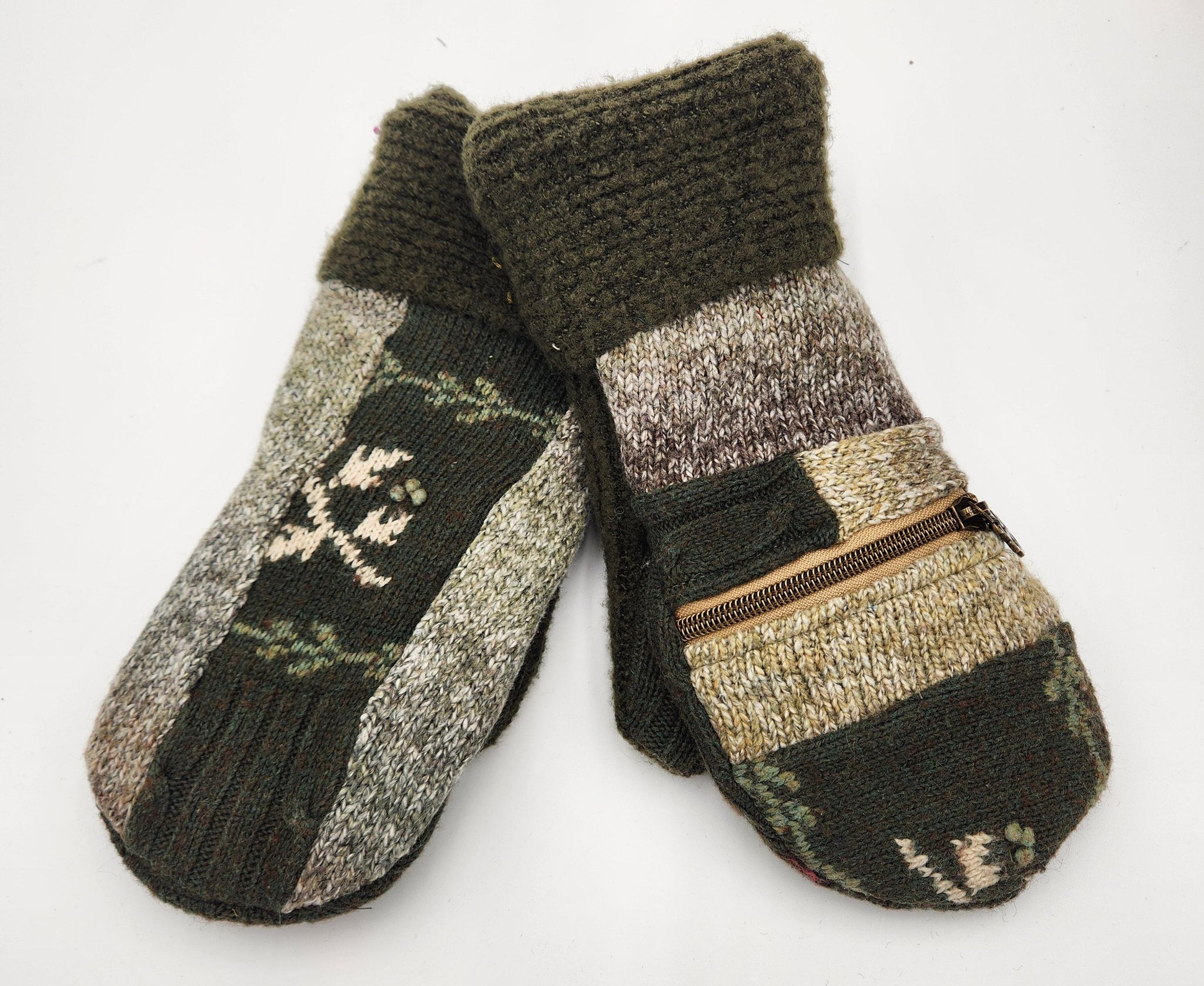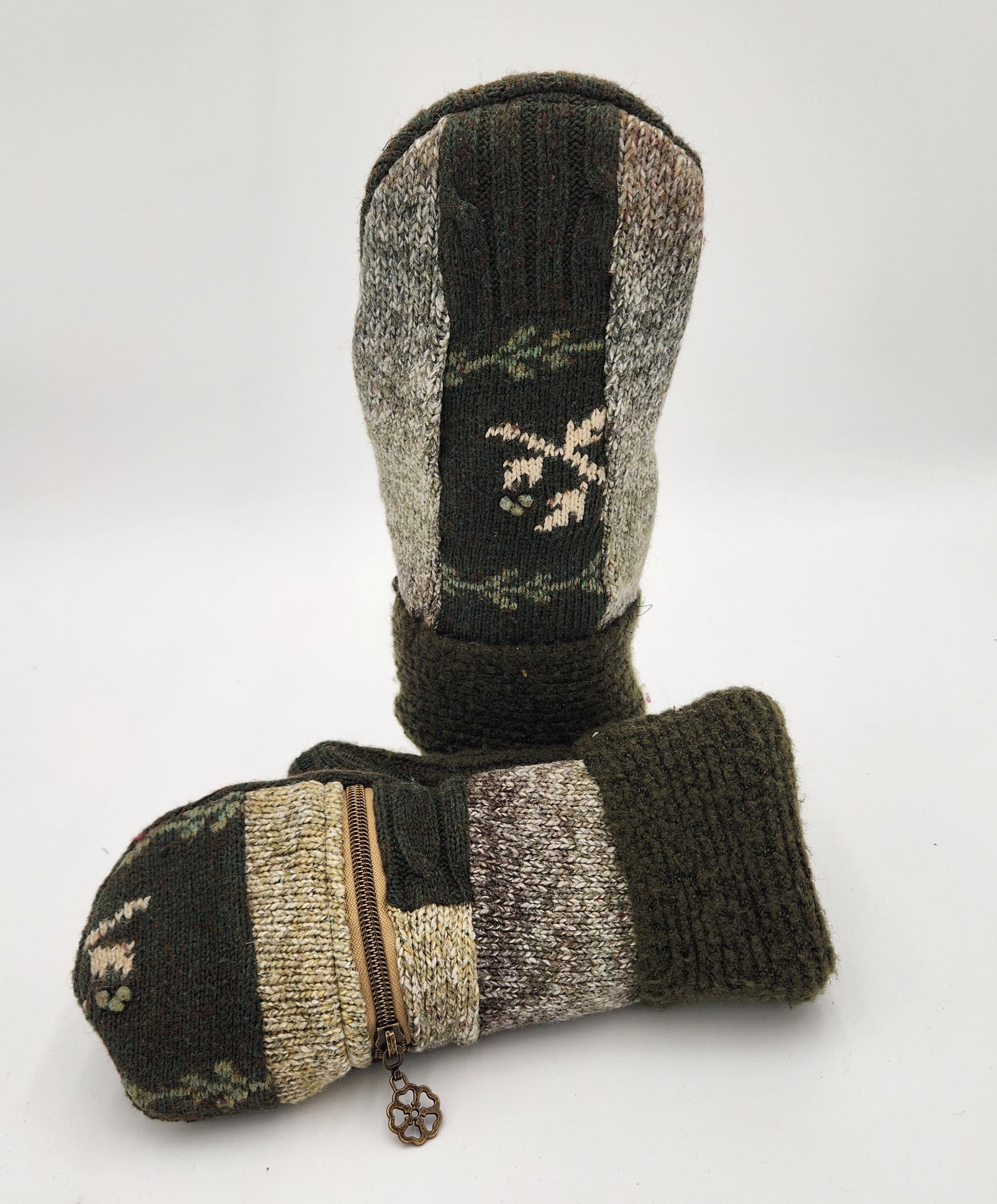 These cozy mittens are handmade from repurposed fabrics, making them both eco-friendly and stylish. The design features a functional zipper pocket, perfect for tucking away small essentials like lip balm or a key. Fully lined for extra warmth, these mittens blend practicality with charm, keeping your hands toasty while adding a rustic, one-of-a-kind touch to your winter wardrobe. Made by Josie T. Designs