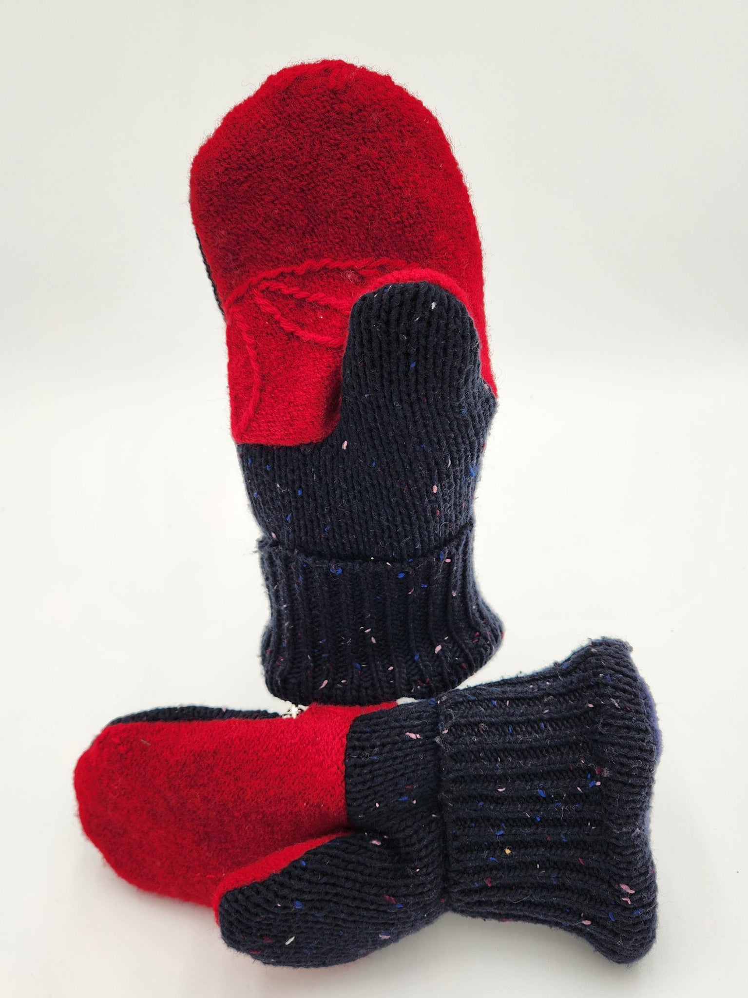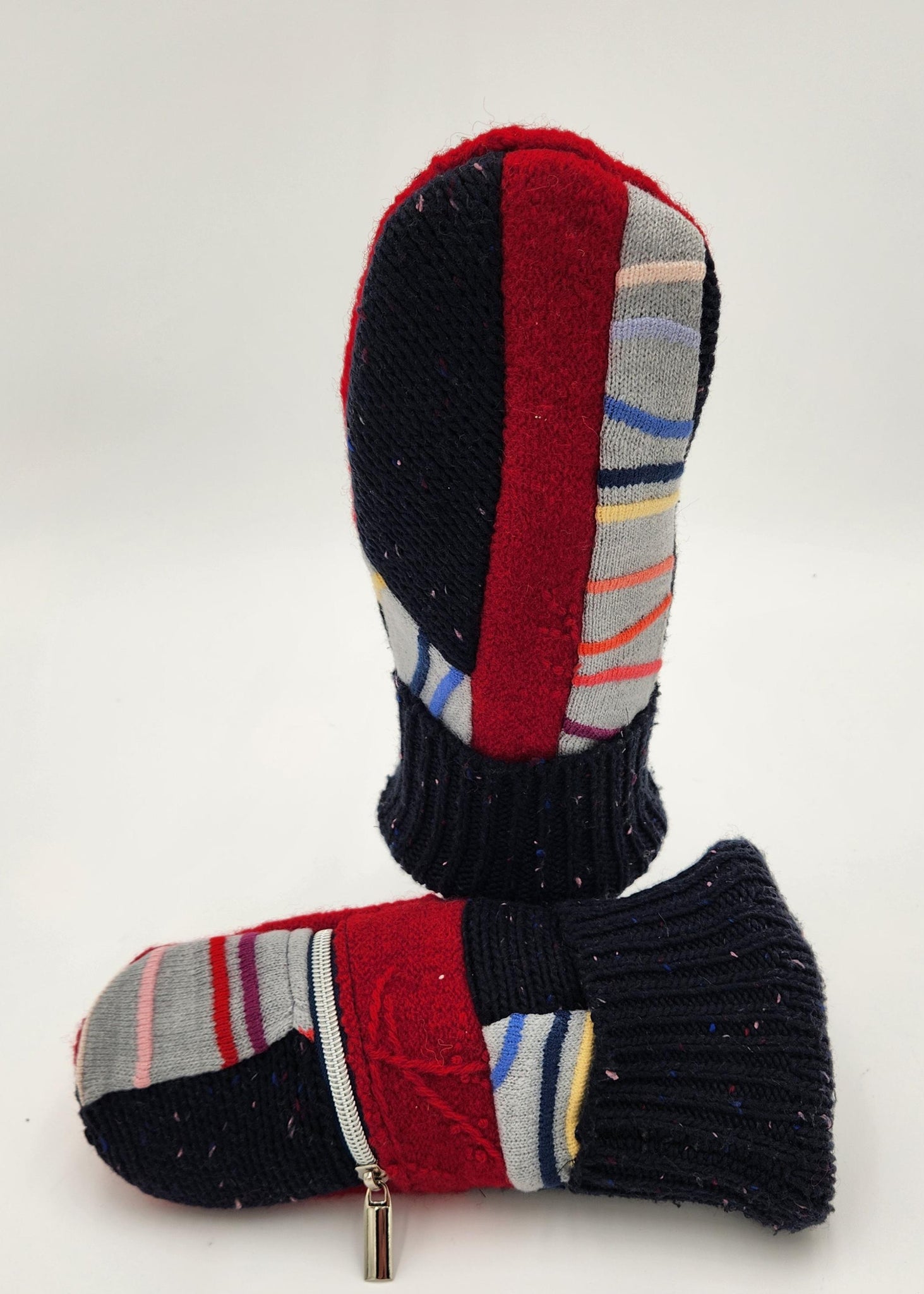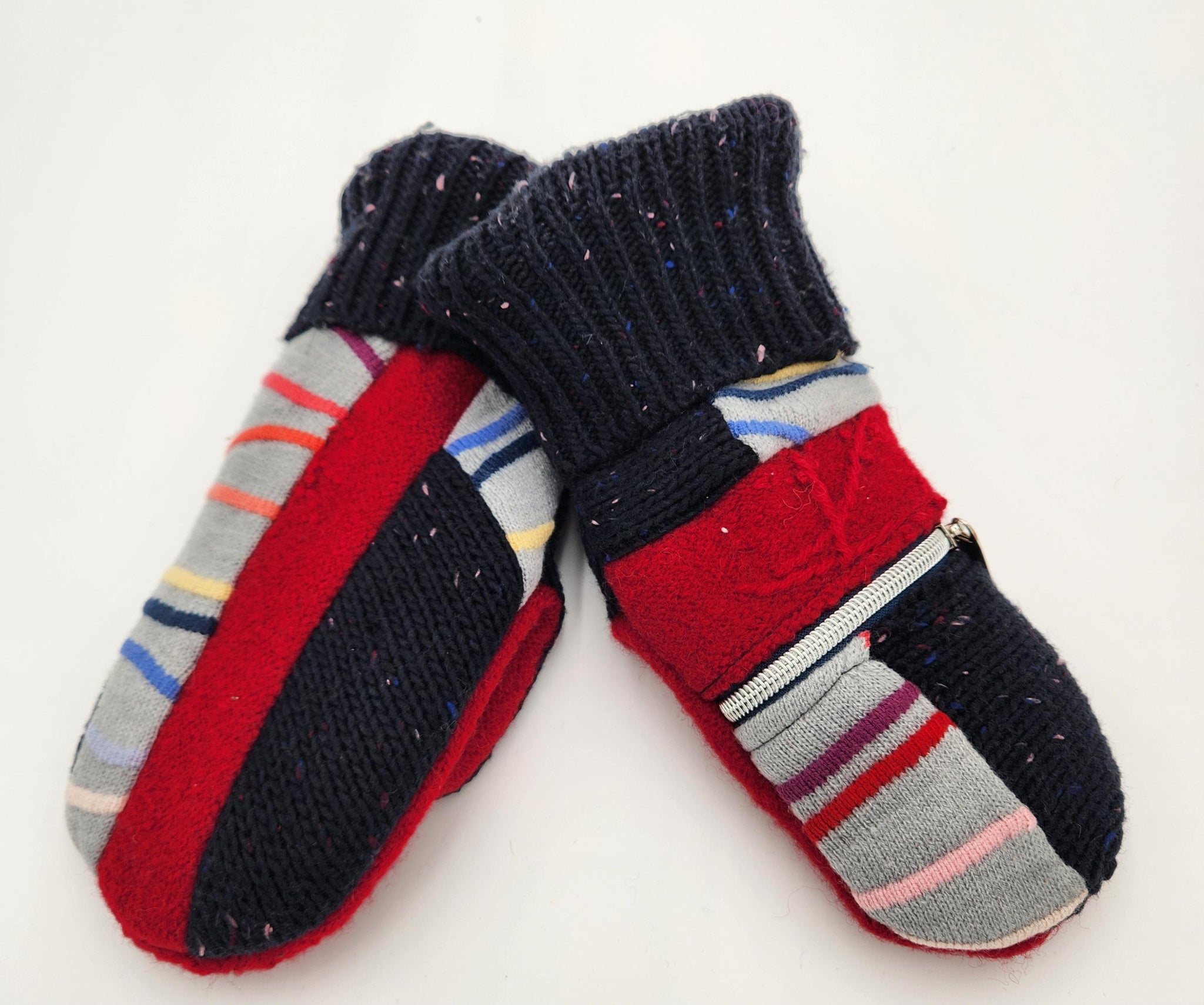 These cozy mittens are handmade from repurposed fabrics, making them both eco-friendly and stylish. The design features a functional zipper pocket, perfect for tucking away small essentials like lip balm or a key. Fully lined for extra warmth, these mittens blend practicality with charm, keeping your hands toasty while adding a rustic, one-of-a-kind touch to your winter wardrobe. Made by Josie T. Designs