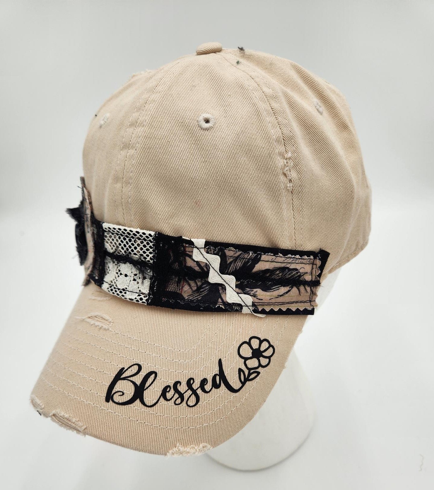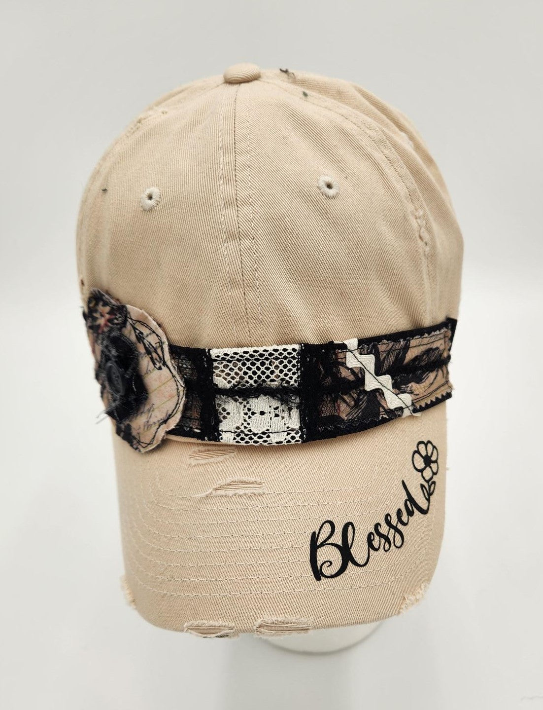 Embrace a casual yet stylish look with this Distressed Army Cap. Crafted from 100% cotton, this cap is designed for comfort and durability. It features an adjustable strap for a perfect fit. This cap pairs easily with casual outfits, graphic tees, denim, and layered looks. Each hat has it's own unique personality with it's own unique embellishments. Handmade by Josie T. Designs.
