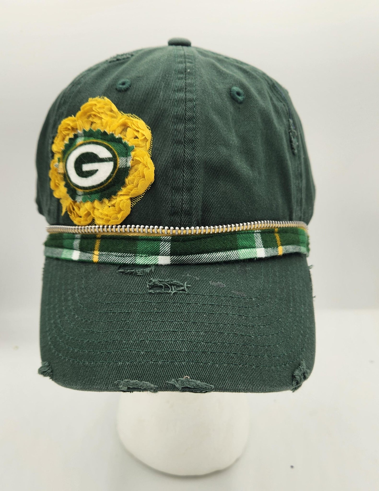 This distressed upcycled/handmade baseball hat is perfect for cheering on our Green Bay Packers! Green, gold, and white make up it's color palette.