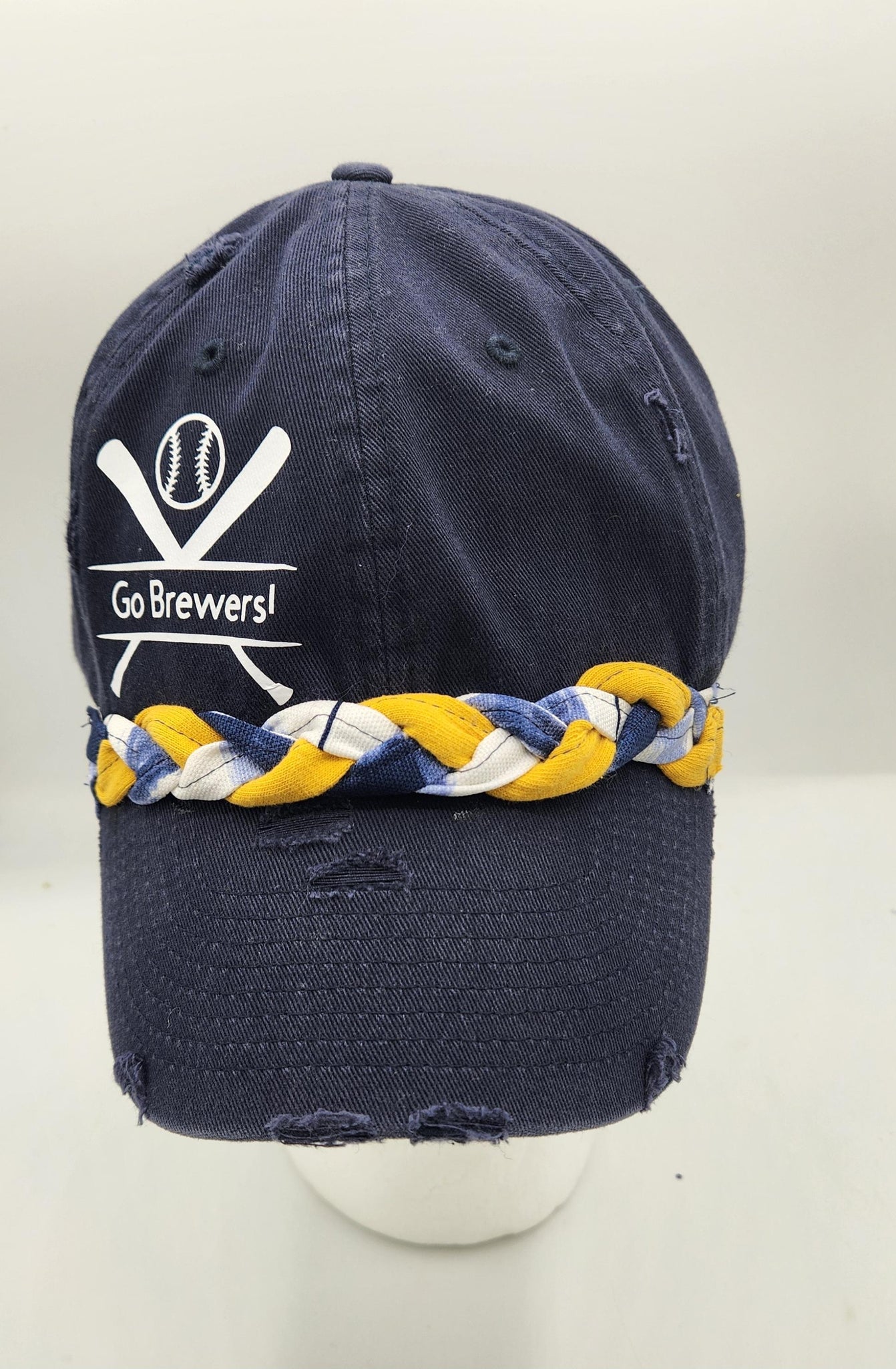This distressed upcycled/handmade baseball hat is perfect for cheering on our Milwaukee Brewers! It is embellished with it's rich team colors.