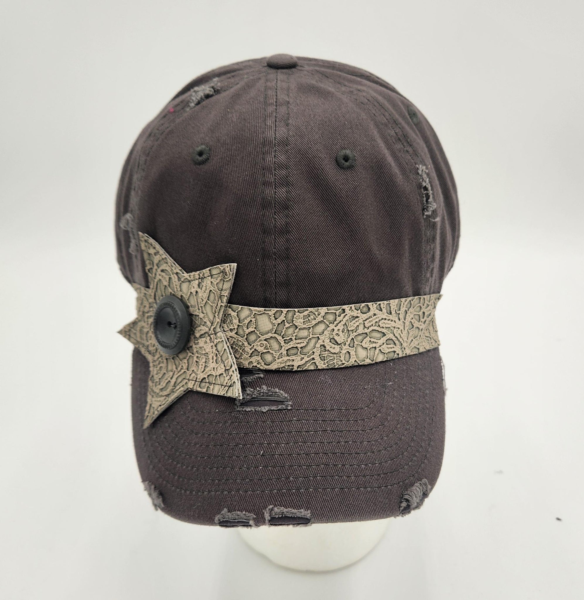 This handmade distressed baseball hat has it's own unique personality. I love to embellish them with any thing that I can get my hands on. I use unique fabrics, vintage buttons, yarns, and so much more. Each piece is a one of a kind item. Made by Josie T. Designs