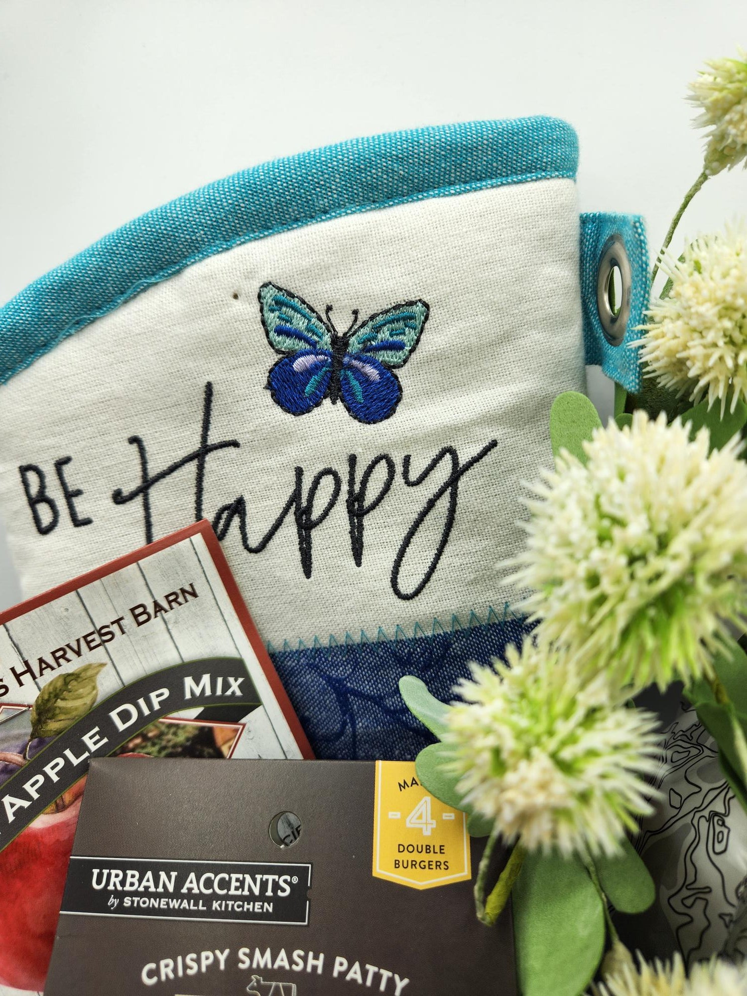 Brighten someone’s day with this cheerful gourmet gift basket, packed with delicious flavors and a touch of inspiration. Featuring a cozy “Be Happy” embroidered oven mitt, this basket is filled with hand-selected gourmet treats perfect for sharing, snacking, or gifting.