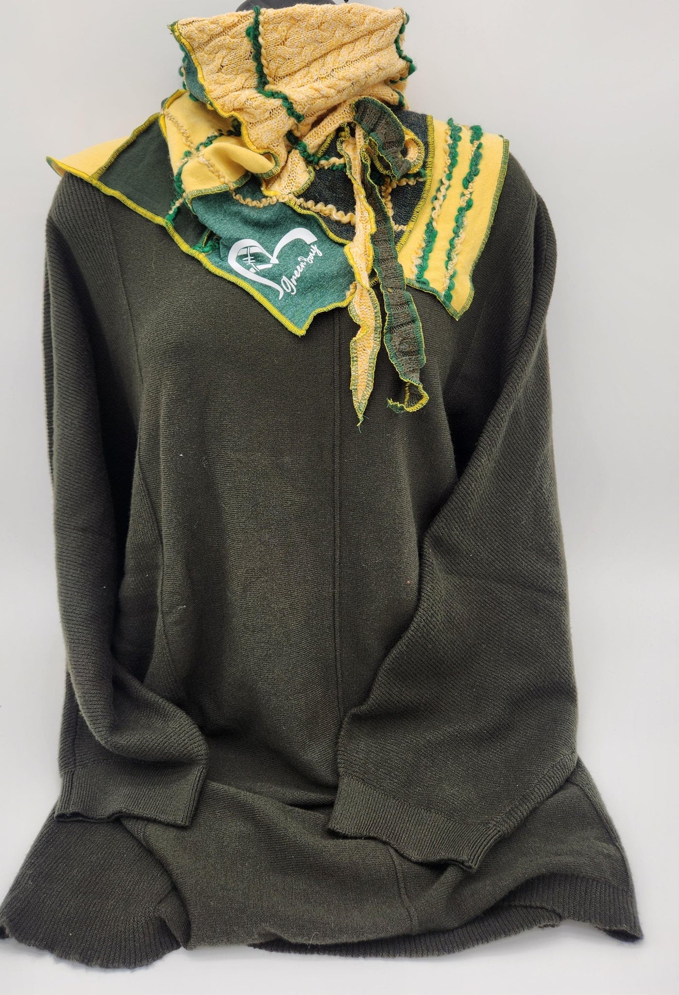 packer scarf, packer apparel, upcycled sweater scarf, re-purposed, cowl neck scarf