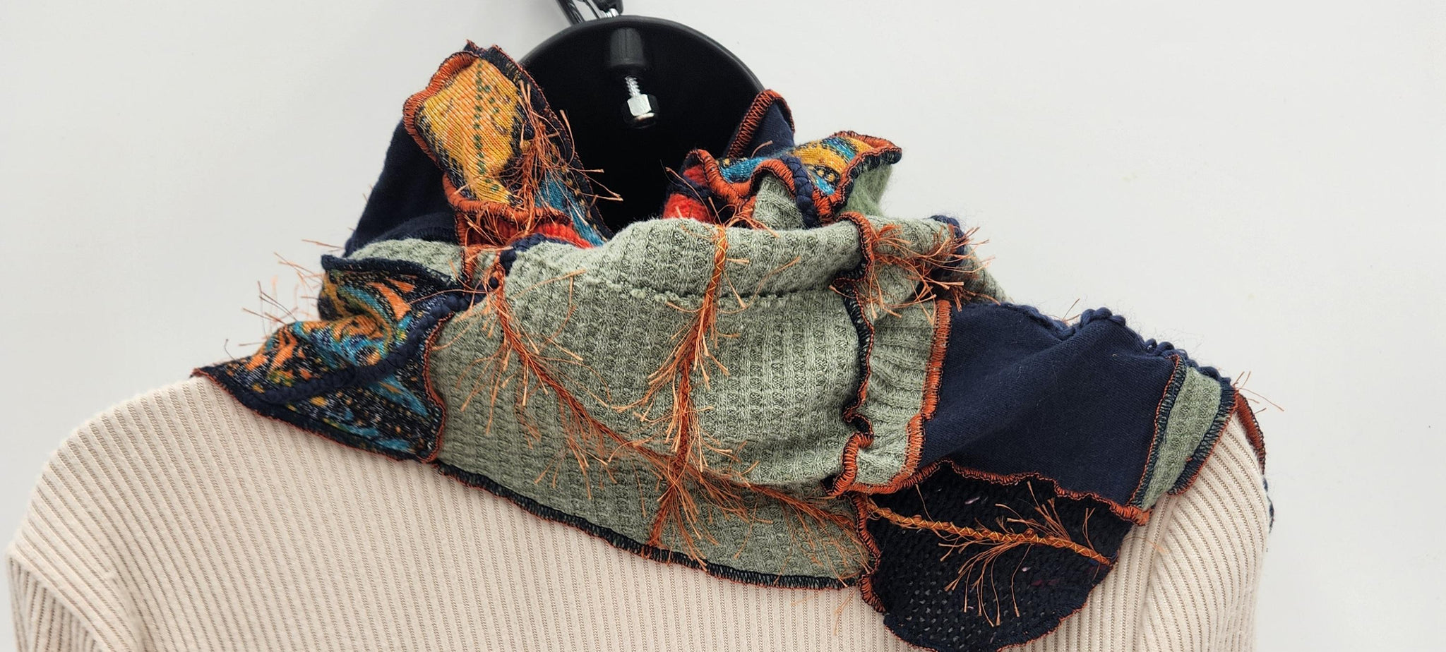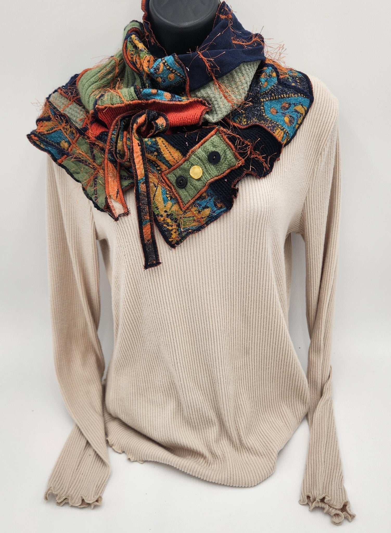 This cowl neck scarf is a one-of-a-kind handmade creation. It is made from quality eco-conscious recycled fabrics and materials. One size fits most. Each item is created with it's own unique personality. There is no fuss with this slip over swag. Just slip over the head, pull the neckline down or fold to your liking and comfort. Made by Josie T. Designs