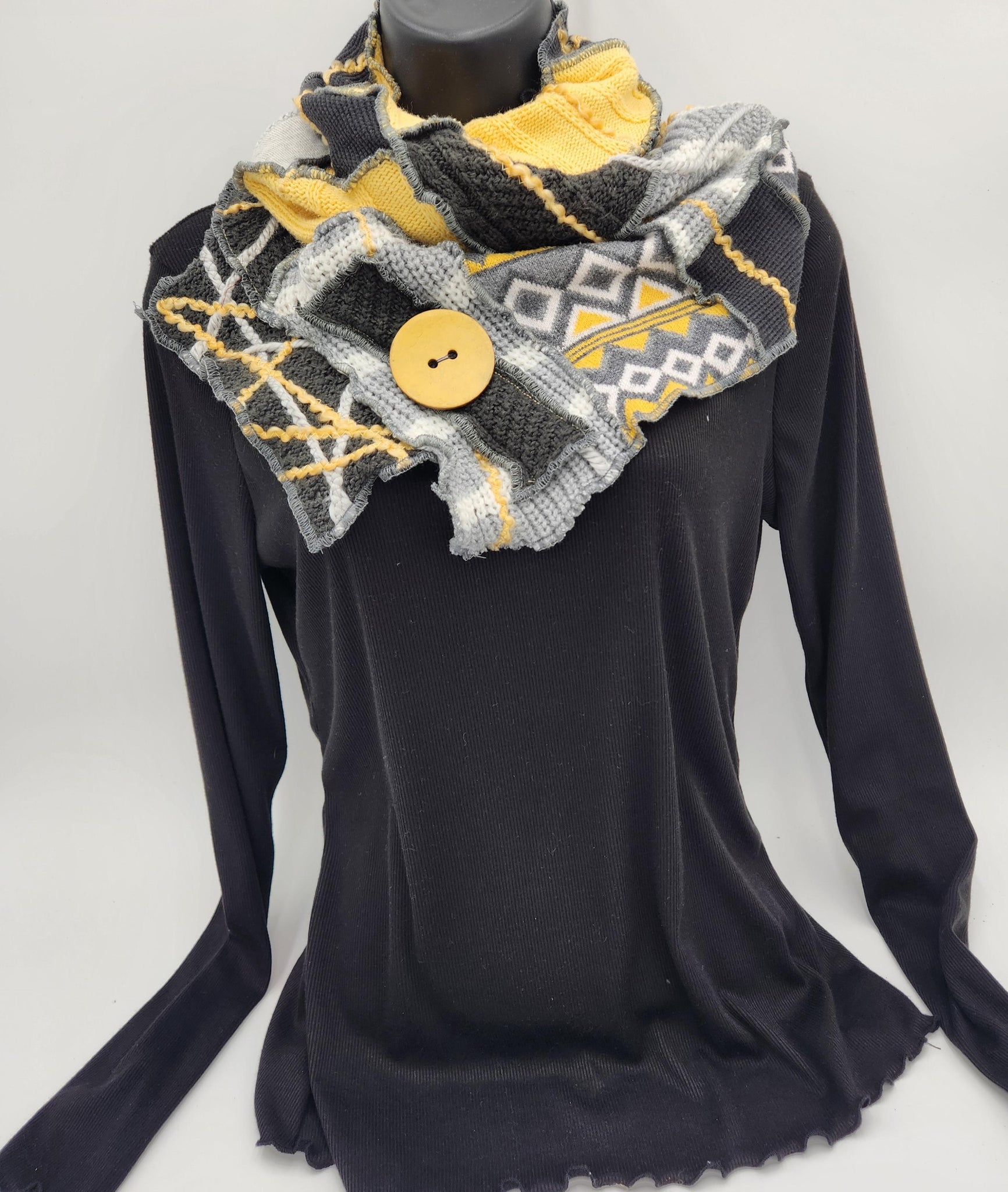 This cowl neck scarf is a one-of-a-kind handmade creation. It is made from quality eco-conscious recycled fabrics and materials. One size fits most. Each item is created with it's own unique personality. There is no fuss with this slip over swag. Just slip over the head, pull the neckline down or fold to your liking and comfort. Made by Josie T. Designs