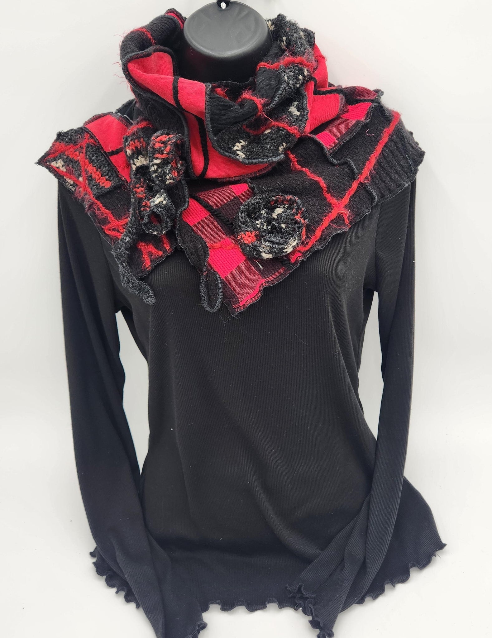 This cowl neck scarf is a one-of-a-kind handmade creation. It is made from quality eco-conscious recycled fabrics and materials. One size fits most. Each item is created with it's own unique personality. There is no fuss with this slip over swag. Just slip over the head, pull the neckline down or fold to your liking and comfort. Made by Josie T. Designs