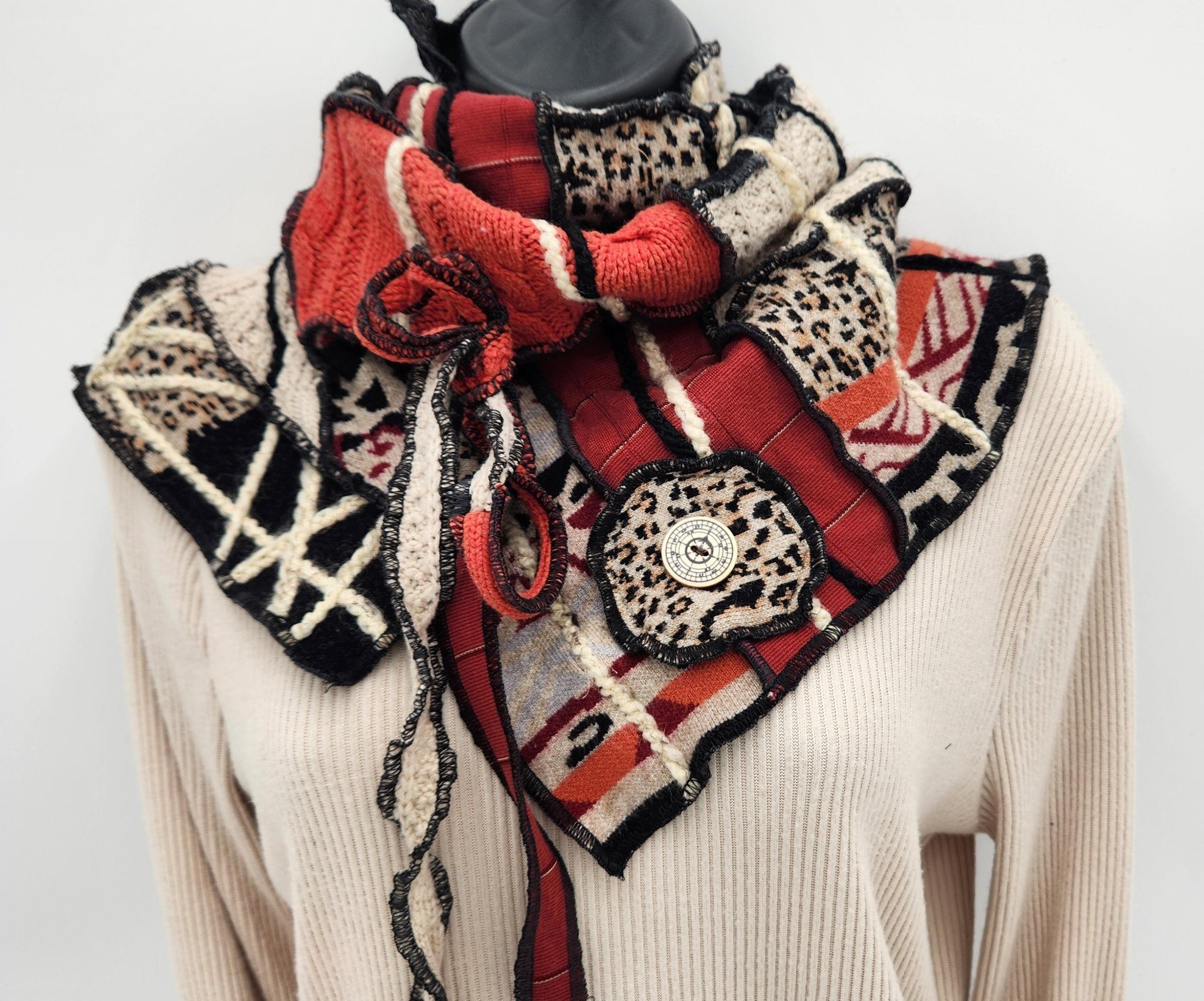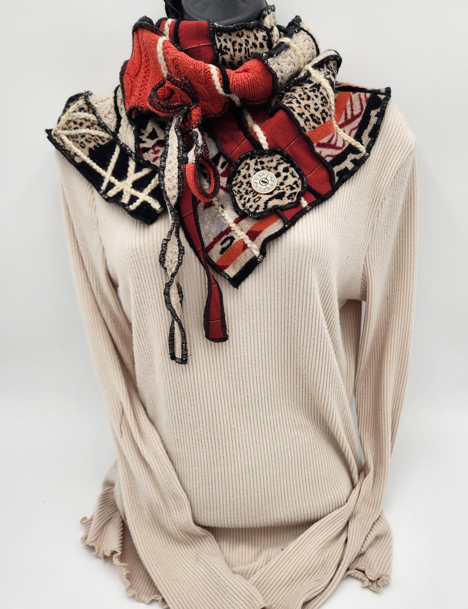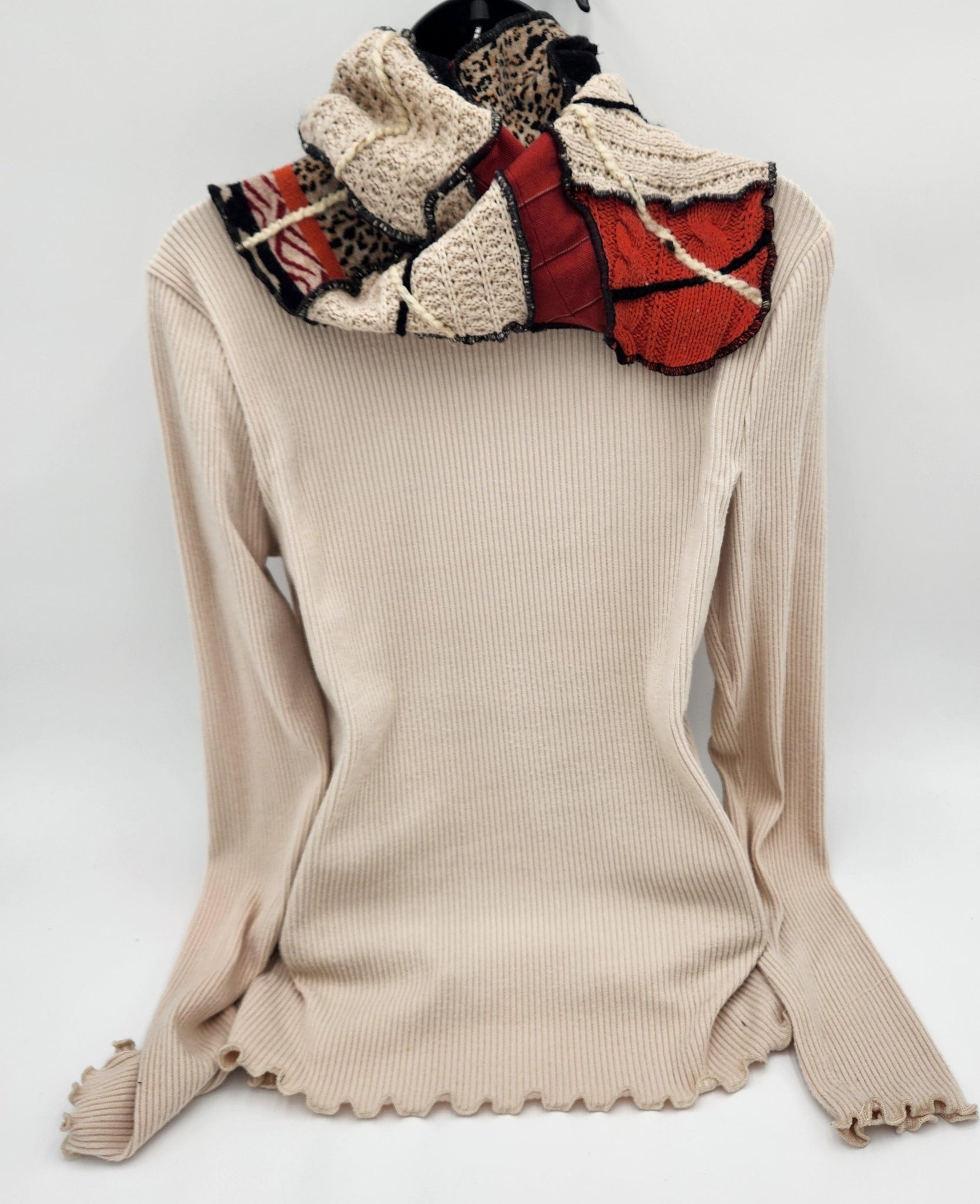 This cowl neck scarf is a one-of-a-kind handmade creation. It is made from quality eco-conscious recycled fabrics and materials. One size fits most. Each item is created with it's own unique personality. There is no fuss with this slip over swag. Just slip over the head, pull the neckline down or fold to your liking and comfort. Made by Josie T. Designs
