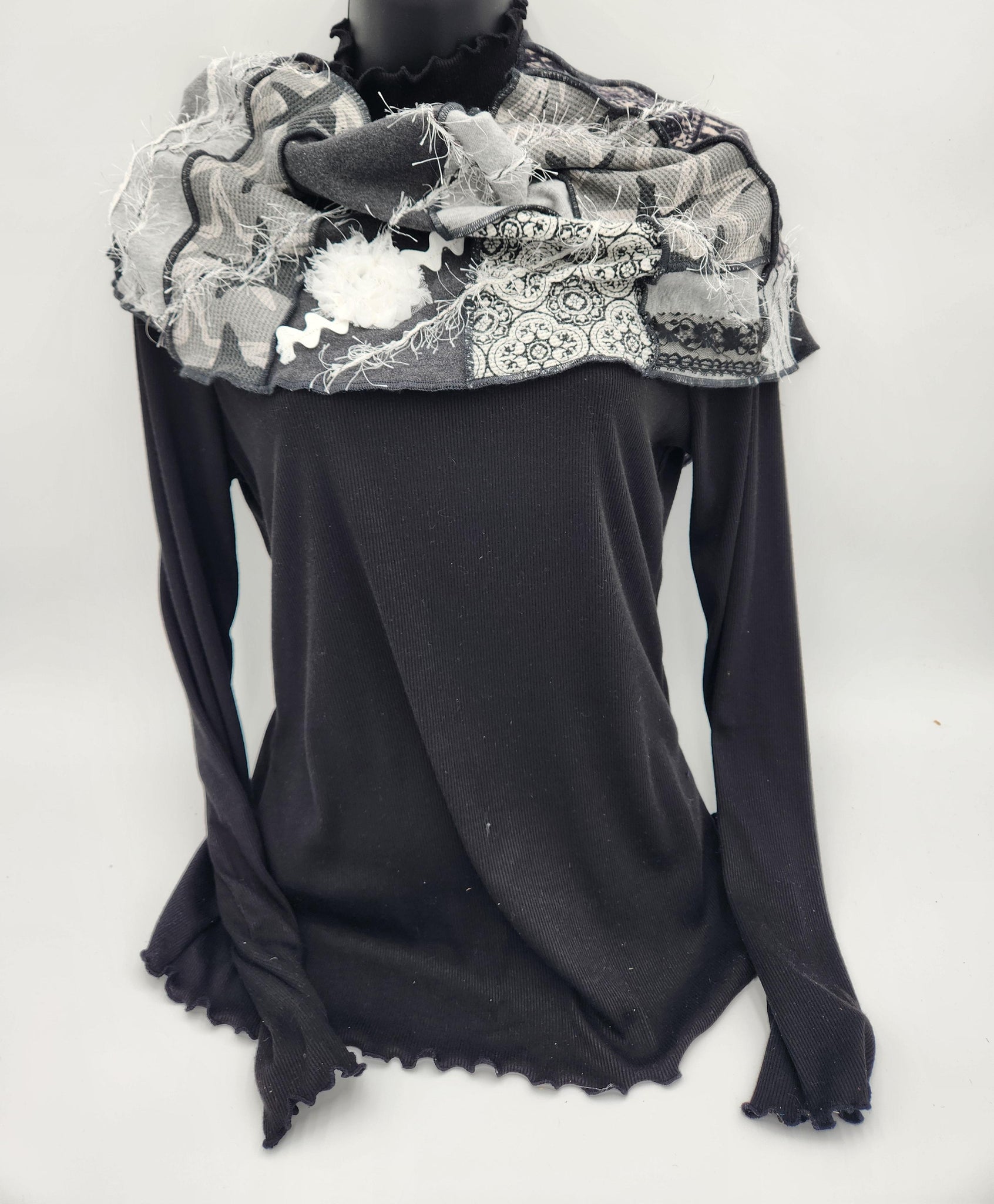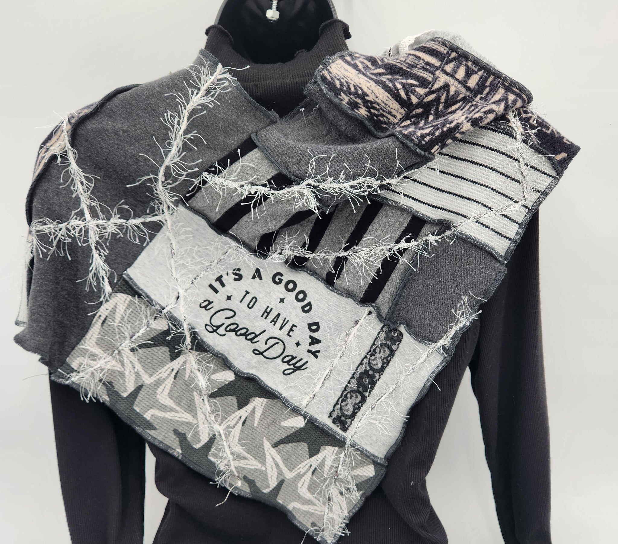 This is a one of a kind  scarf/shawl.  It is a great accent to any simple top in your wardrobe.  Each item is made from upcycled  fabrics, vintage trims, buttons, and any other thing I can get my hands on. Each shawl comes with a removeable tie to give it a different look. Made by Josie T. Designs