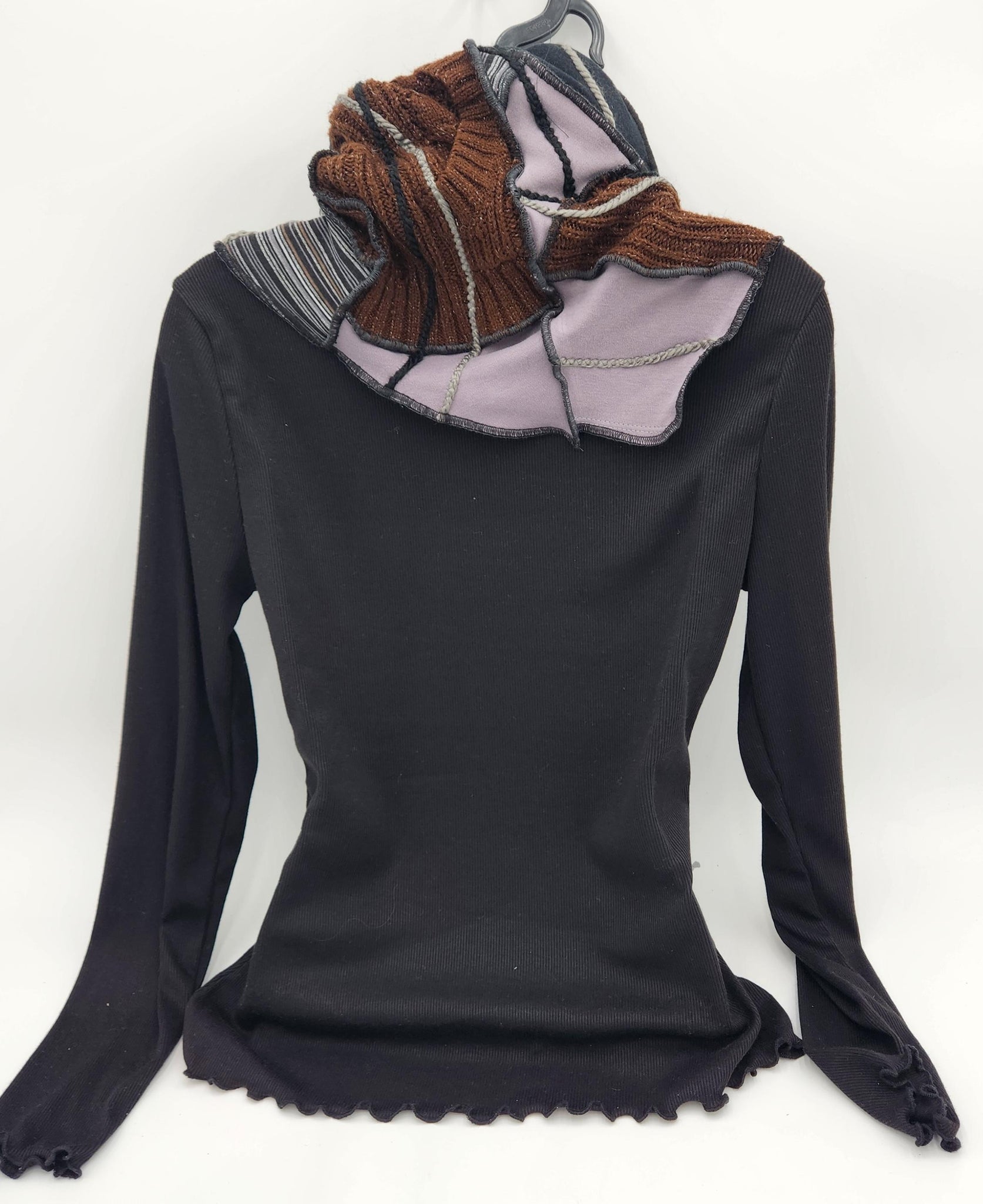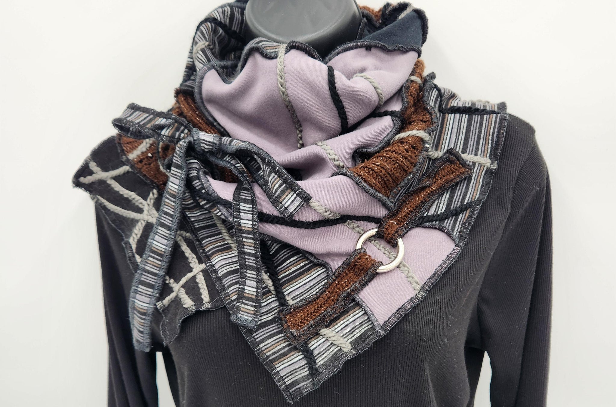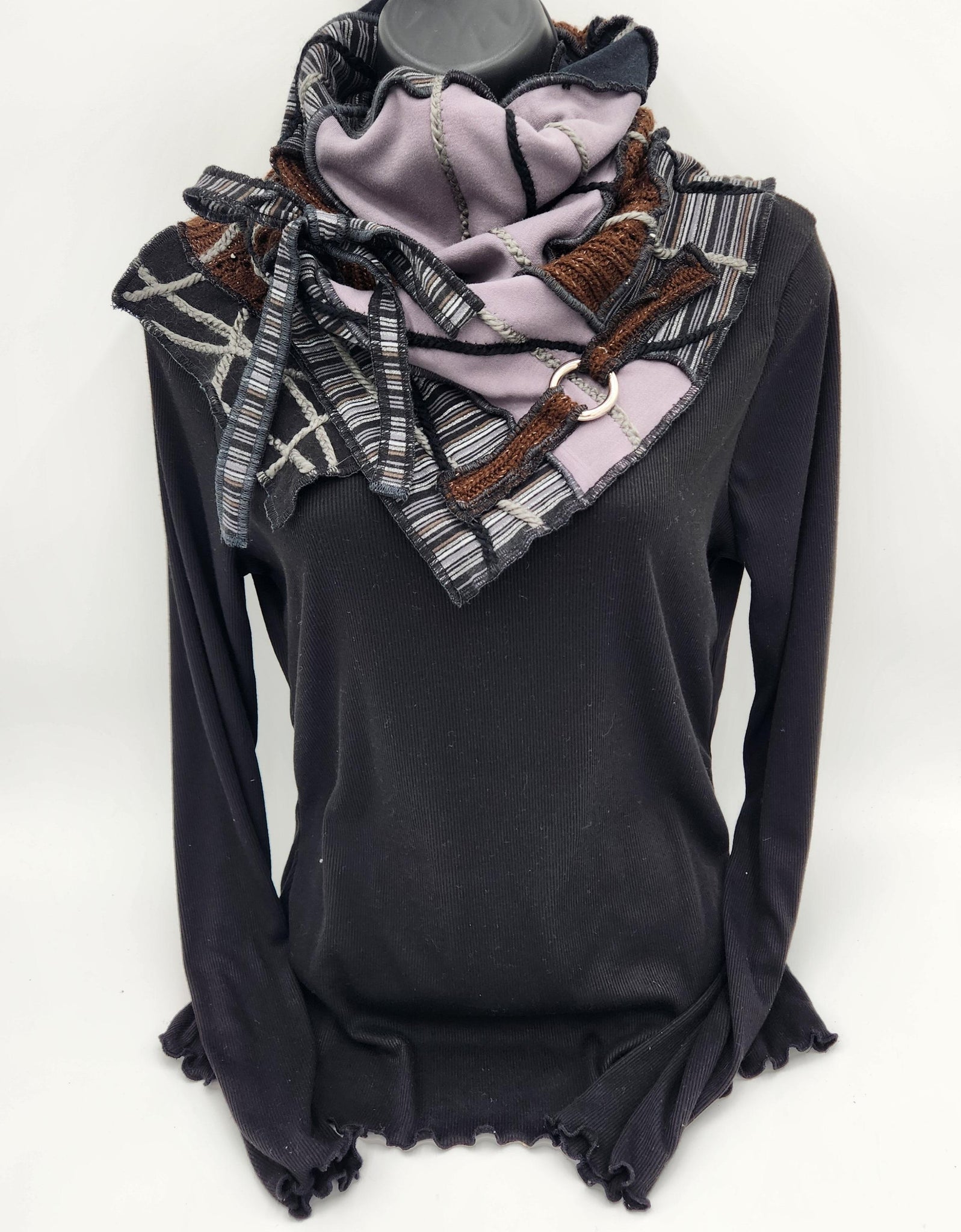 This cowl neck scarf is a one-of-a-kind handmade creation. It is made from quality eco-conscious recycled fabrics and materials. One size fits most. Each item is created with it's own unique personality. There is no fuss with this slip over swag. Just slip over the head, pull the neckline down or fold to your liking and comfort. Made by Josie T. Designs