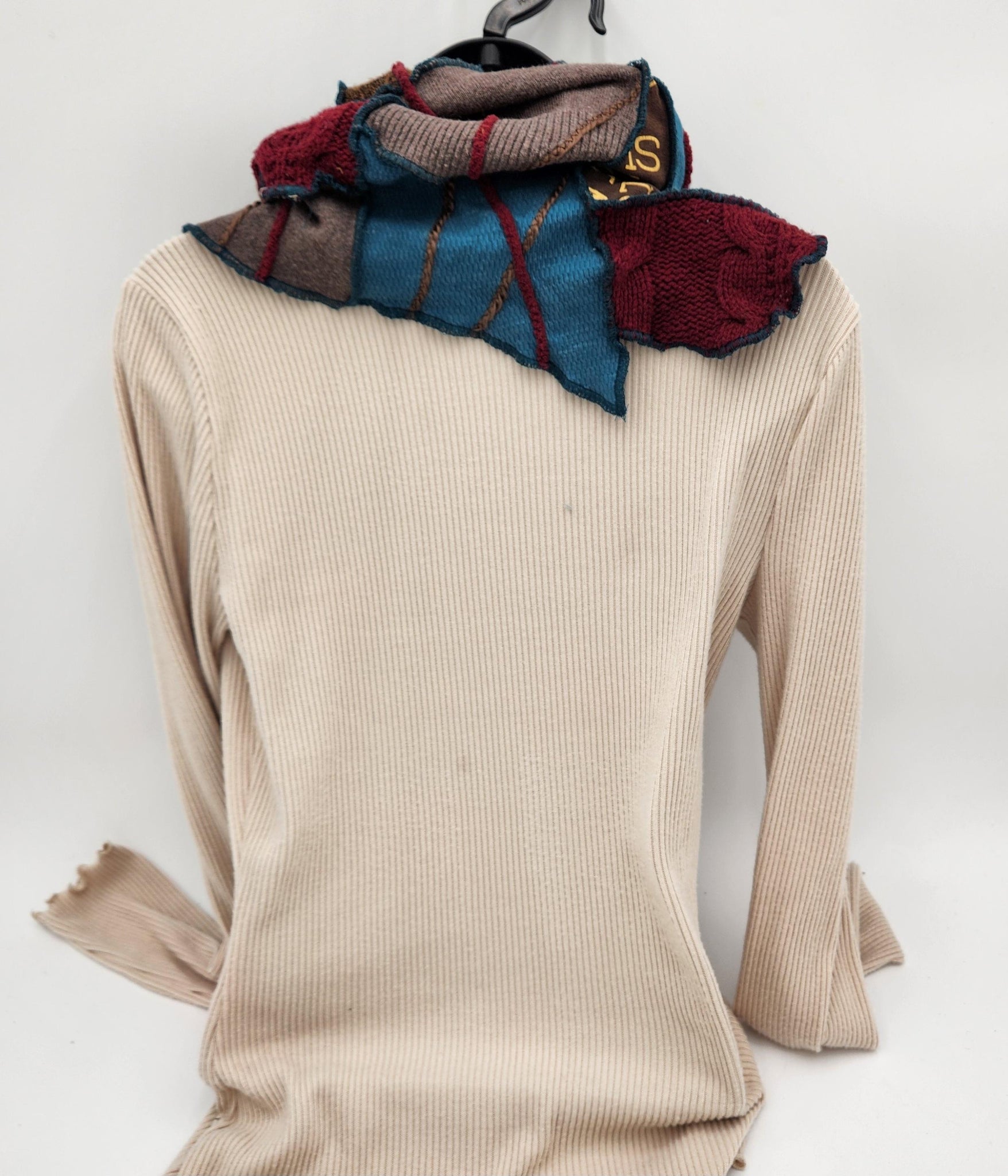 upcycled scarf, swag scarf, sweater scarf, cowl neck scarf, handmade scarf, couture trend, eco-conscious, josie t. designs, reclaimed textiles, repurposed textiles, repurposed fabric projects, DIY upcycled scarf, re-purposed fabric projects, textile art scarf