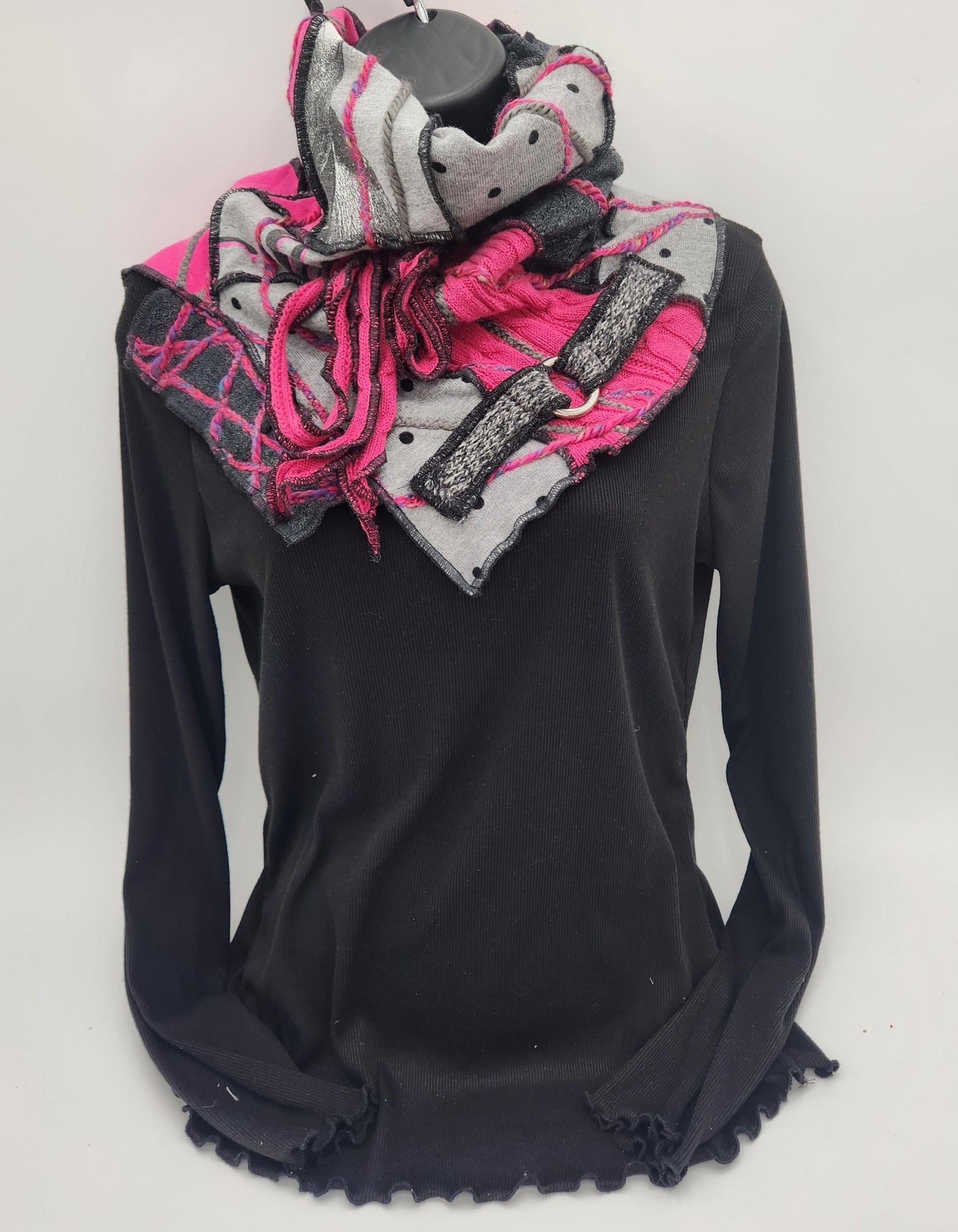 This cowl neck scarf is a one-of-a-kind handmade creation. It is made from quality eco-conscious recycled fabrics and materials. One size fits most. Each item is created with it's own unique personality. There is no fuss with this slip over swag. Just slip over the head, pull the neckline down or fold to your liking and comfort. Made by Josie T. Designs