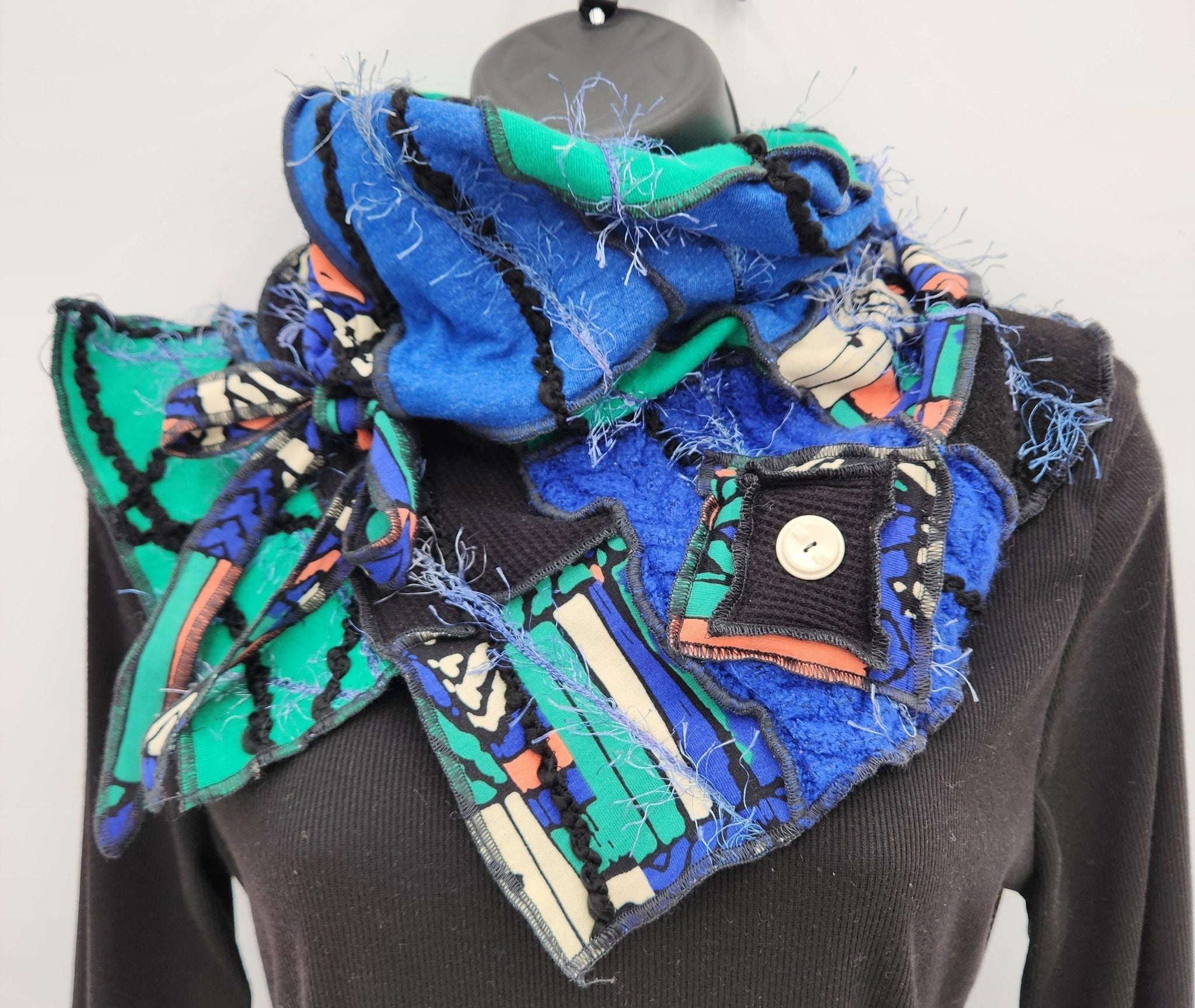 This cowl neck scarf is a one-of-a-kind handmade creation. It is made from quality eco-conscious recycled fabrics and materials. One size fits most. Each item is created with it's own unique personality. There is no fuss with this slip over swag. Just slip over the head, pull the neckline down or fold to your liking and comfort. Made by Josie T. Designs