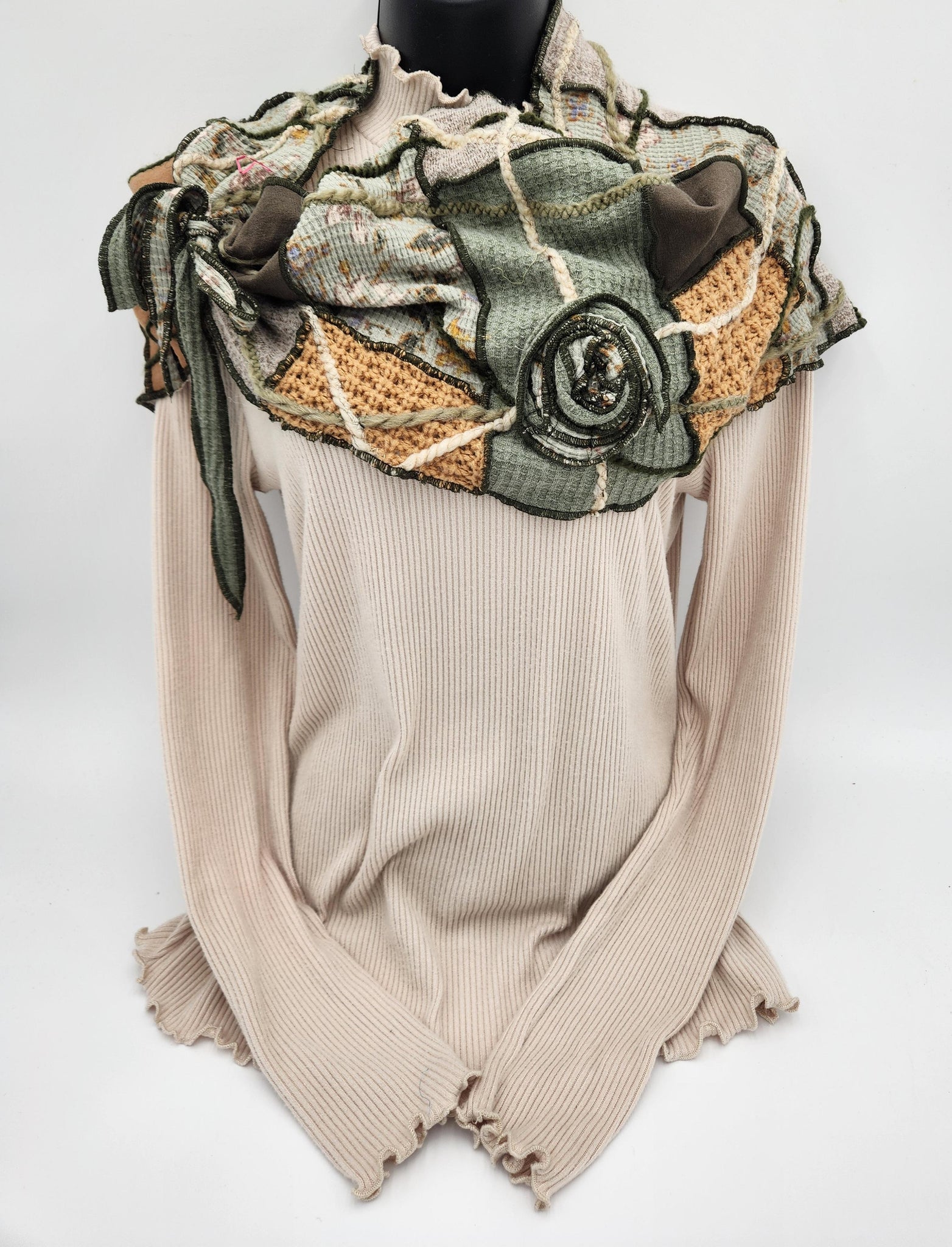 This is a one of a kind scarf/shawl. It is a great accent to any simple top in your wardrobe. Each item is made from upcycled fabrics, vintage trims, buttons, and any other thing I can get my hands on. Each shawl comes with a removeable tie to give it a different look. Made by Josie T. Designs