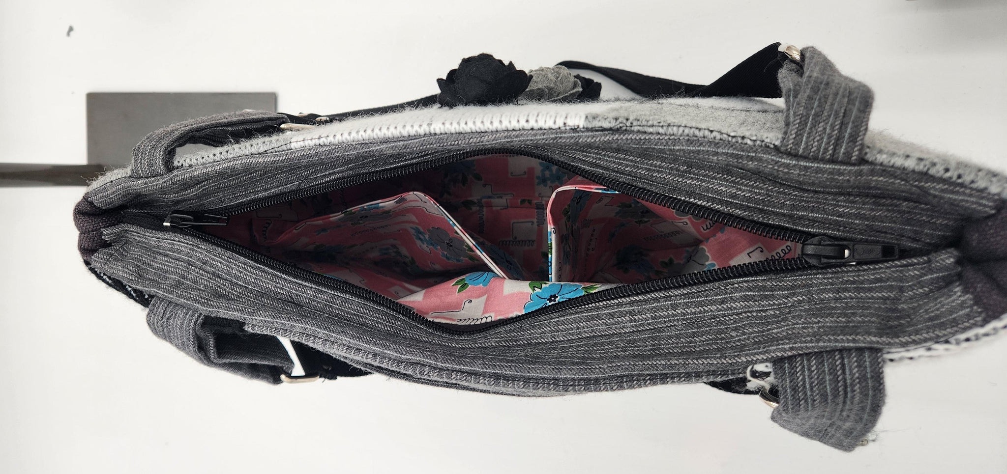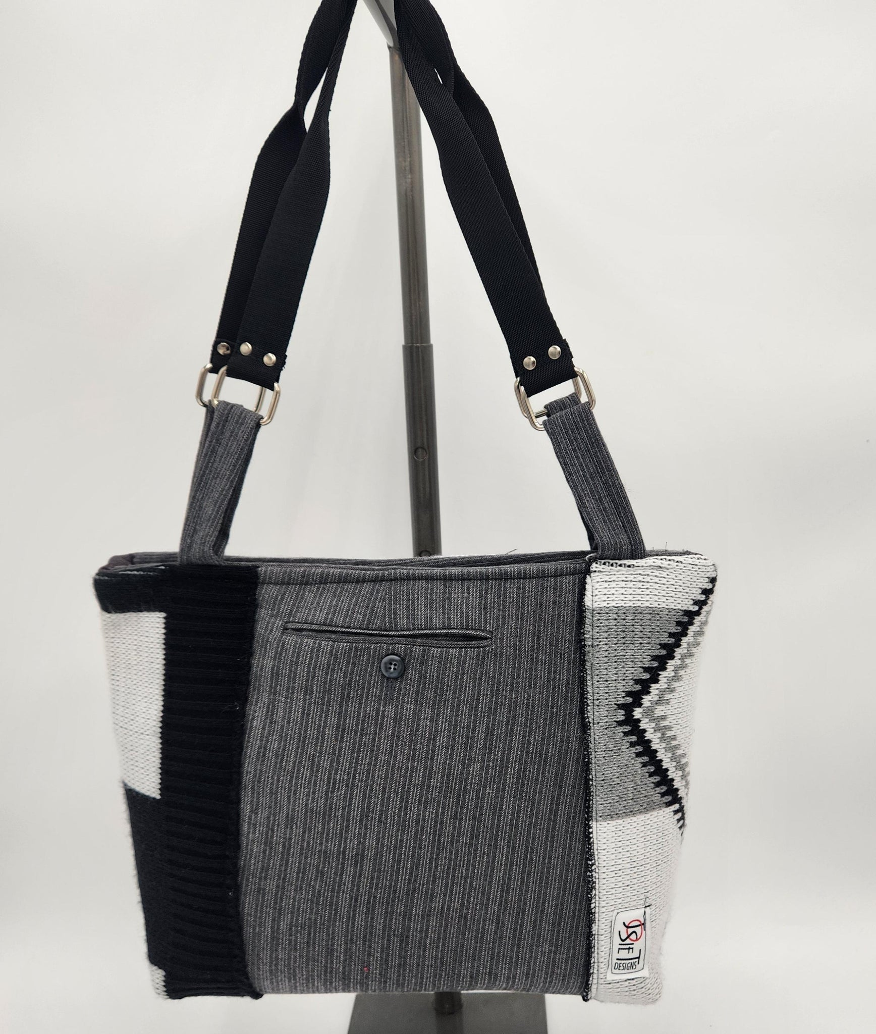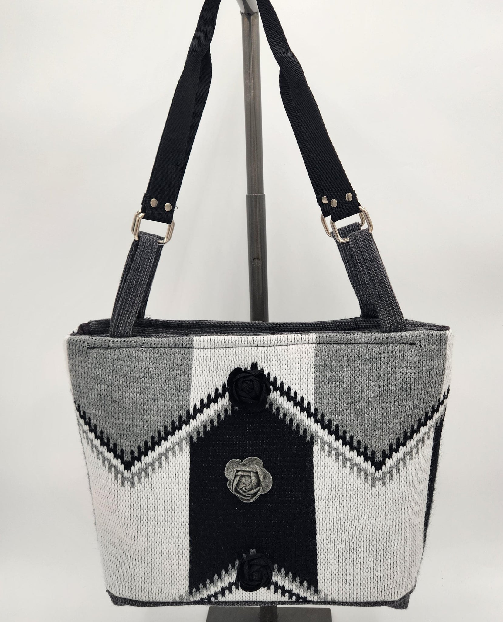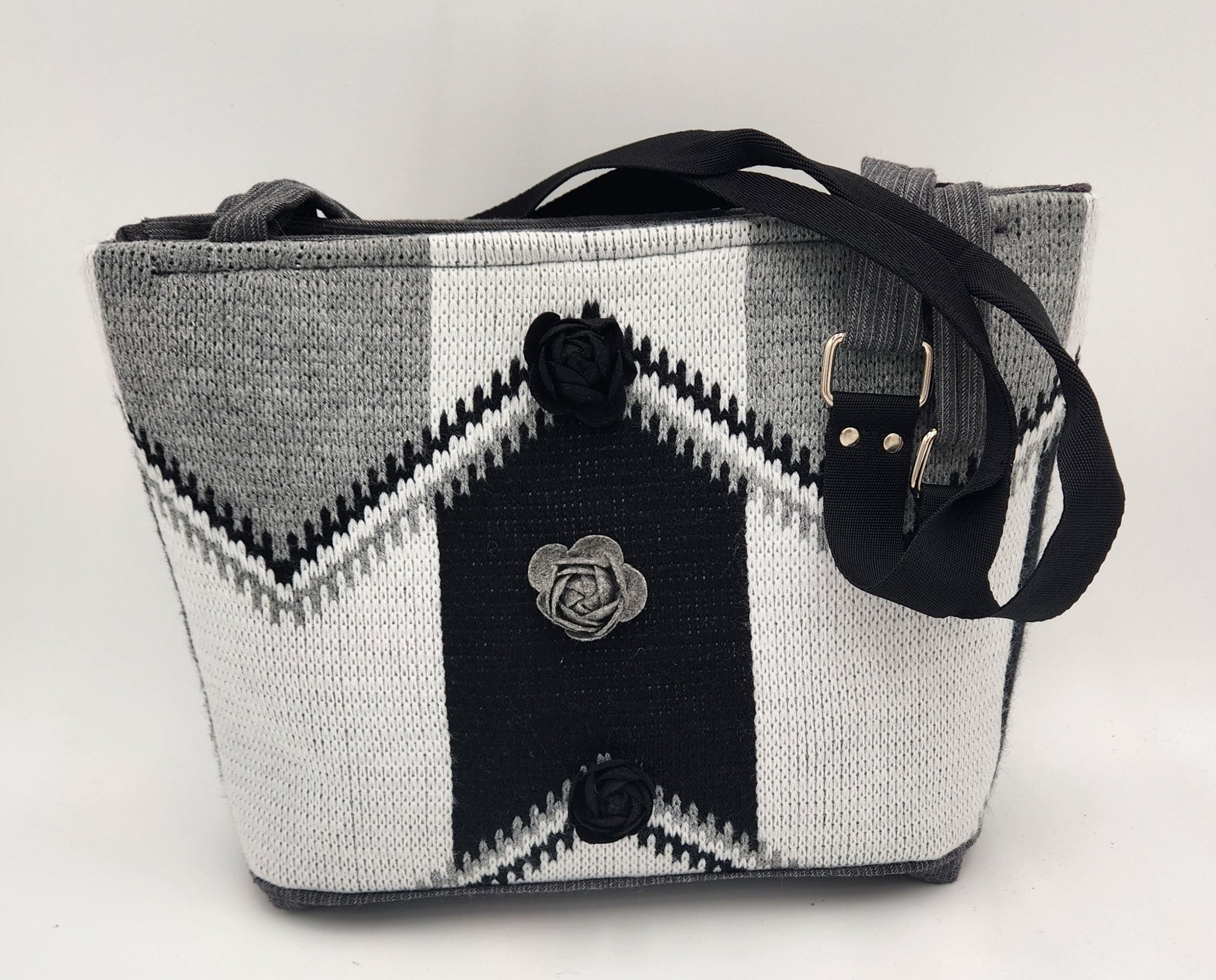 Elevate your everyday style with this beautifully crafted handmade shoulder bag. Featuring a striking gray, black, and white color palette, this tote blends modern geometric patterns with soft handcrafted charm. Three textured rosette accents add a feminine touch to the bold design, making it the perfect statement piece for any outfit.