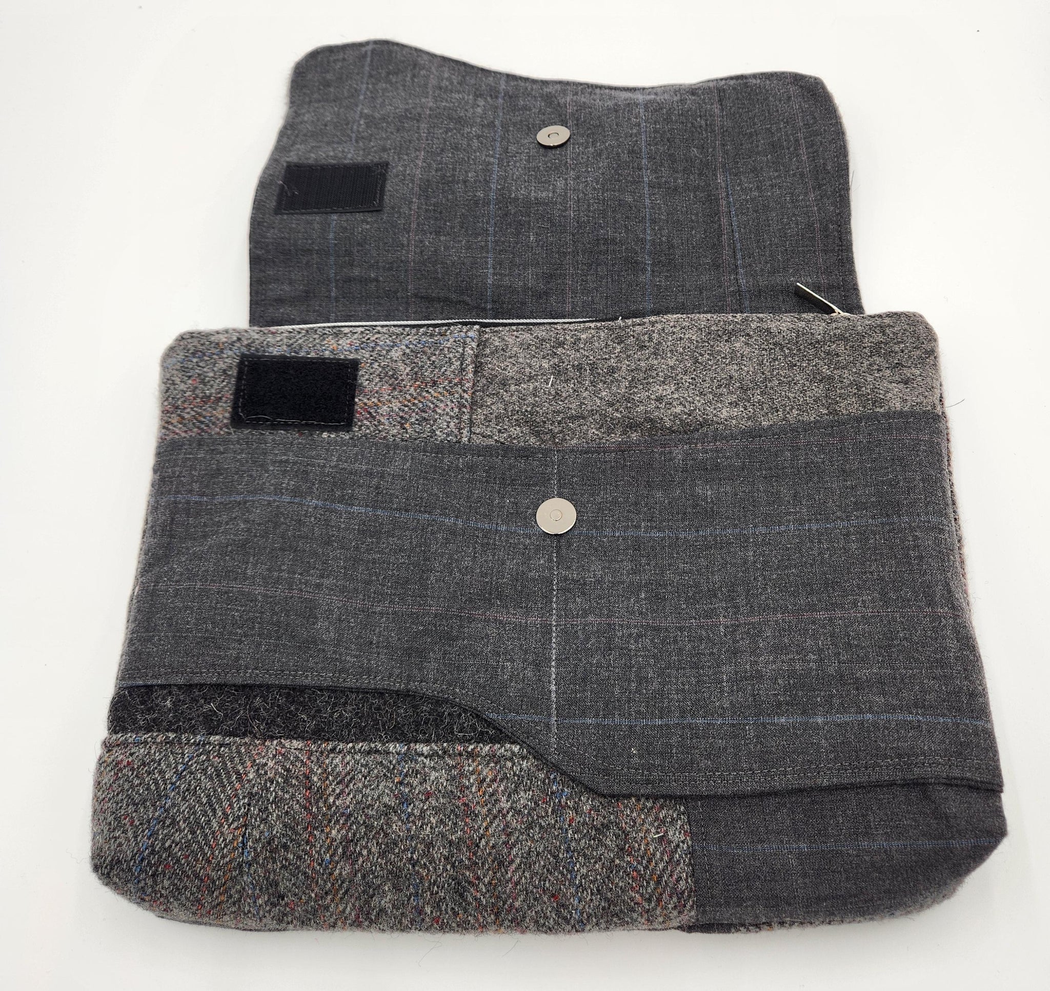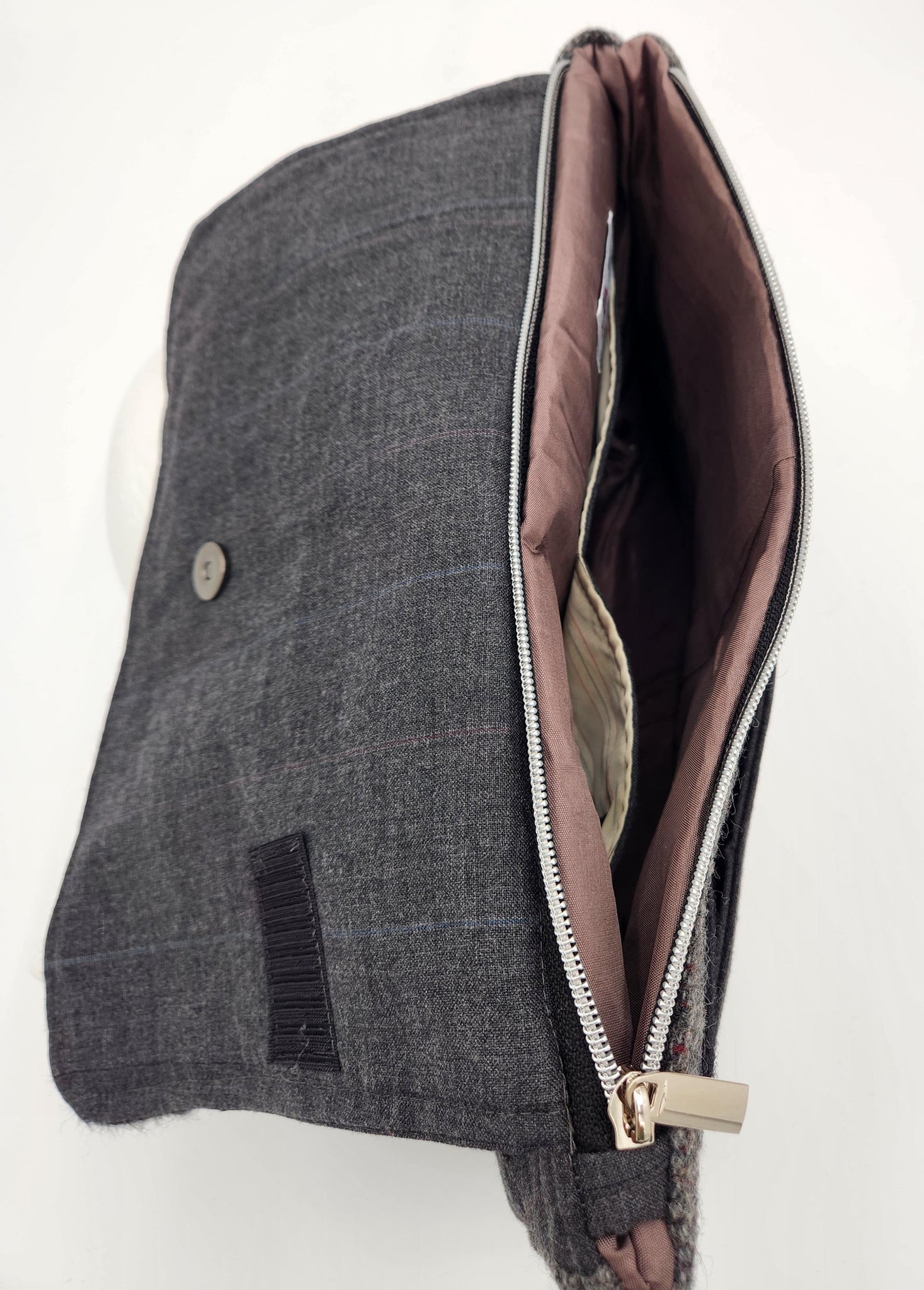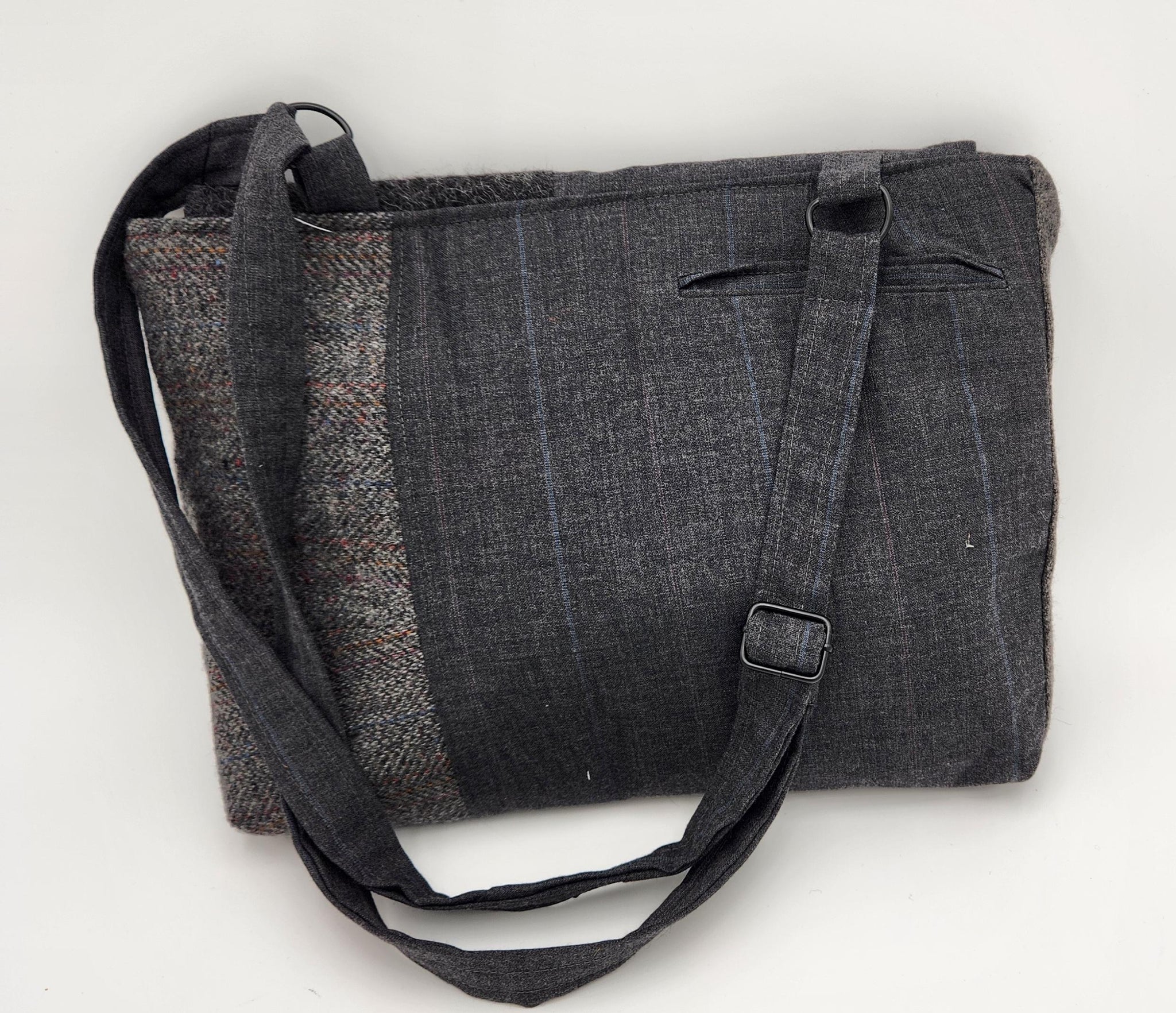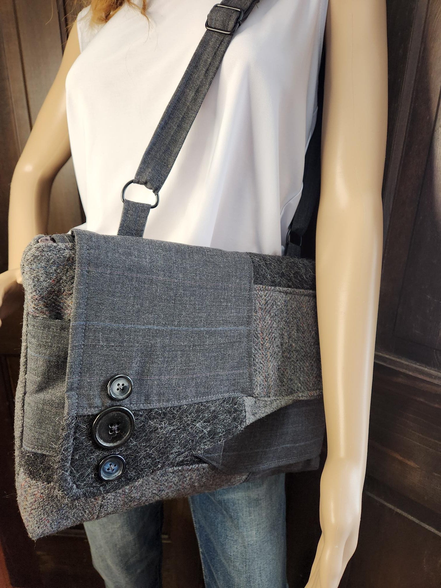 This upcycled crossbody messenger bag will go with just about any outfit. It's color pallet consists of a variety of blacks and grays. It is made out of recycled men's suitcoats and a variety of cotton fabrics.  It is lightweight but very sturdy.  It has an adjustable crossbody handle that measures approx. 54" long. The front is embellished with cute buttons and an asymmetrical flap with a magnetic closure.  It has an inside zipper to keep your items safe, 2 front pockets along with an outside back pocket.  The inside is fully lined with 2 pockets.  My products are never duplicated which makes them one of a kind. This bag measures approx. 14" wide x 12" high x 2" thick.