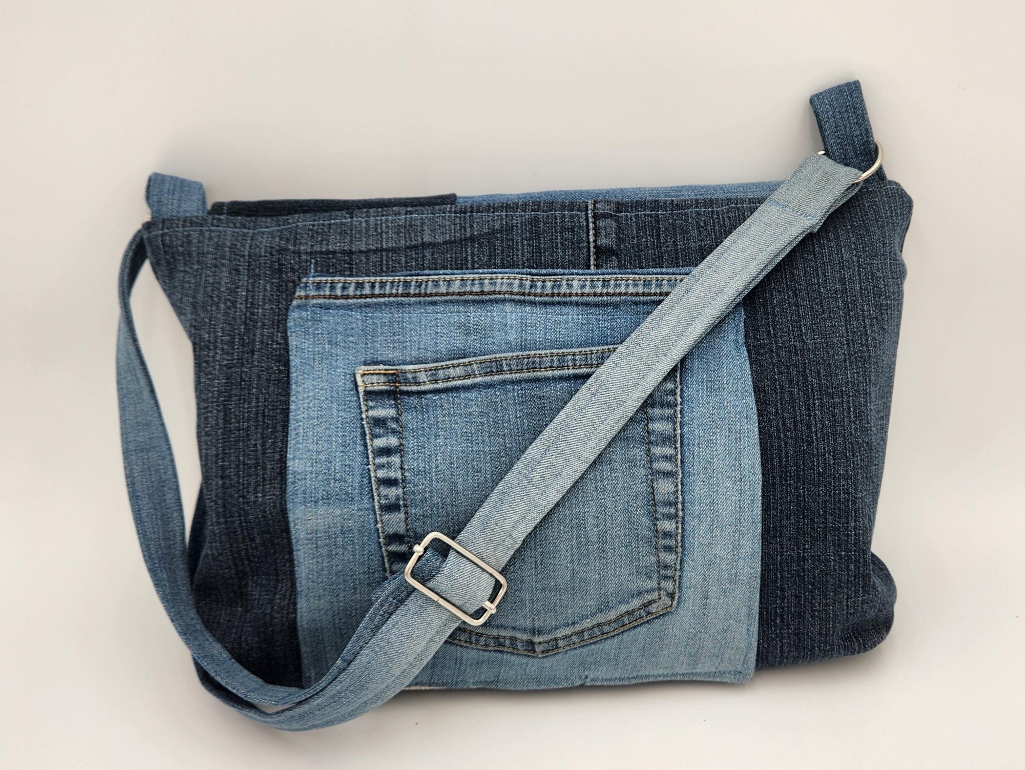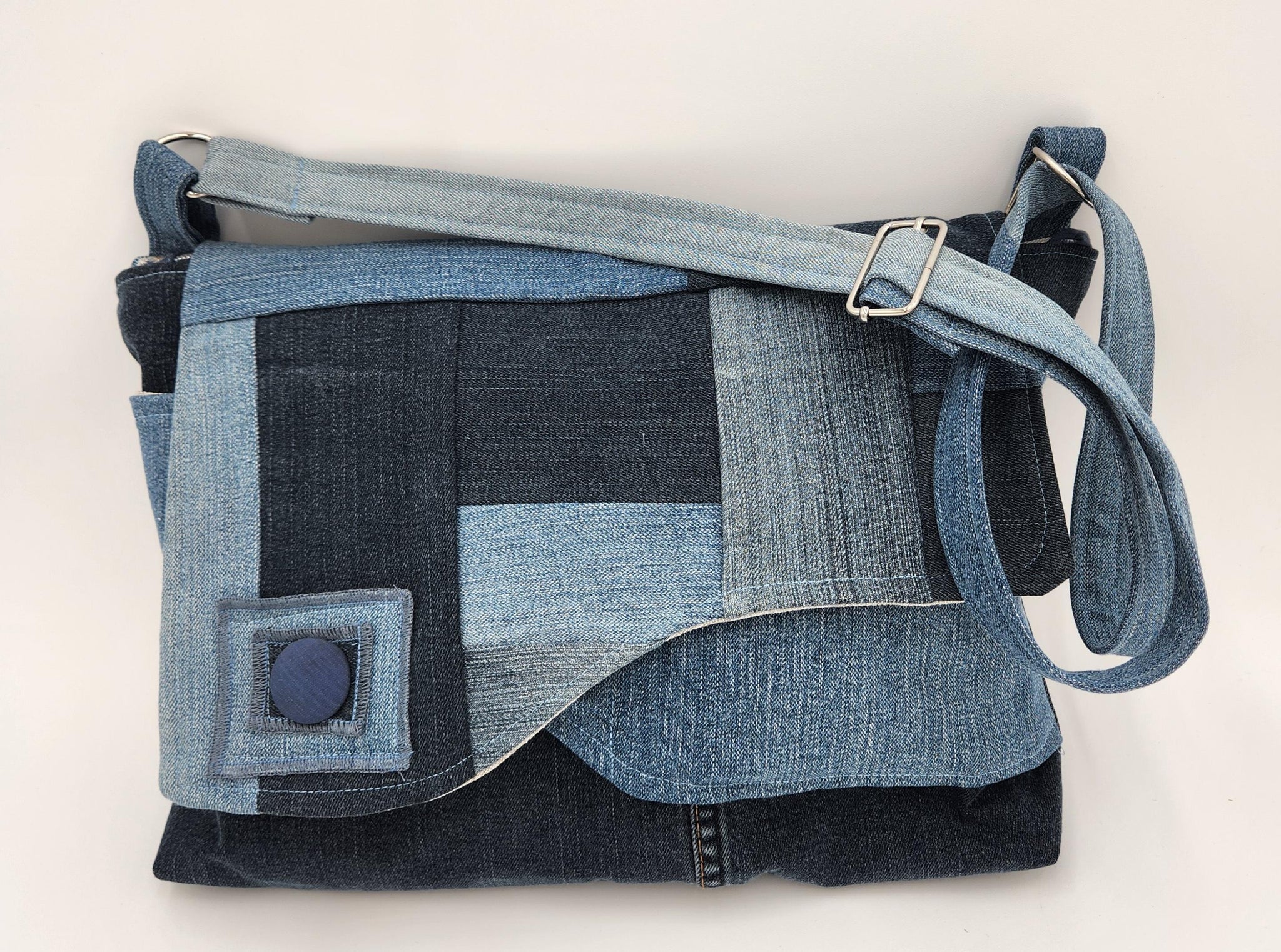 This upcycled denim crossbody bag blends sustainable style with everyday practicality. Crafted from repurposed blue jeans, the patchwork design showcases varied denim washes for a modern, casual look that’s truly one of a kind. The soft yet durable fabric gives this bag a relaxed feel while maintaining structure for daily use.