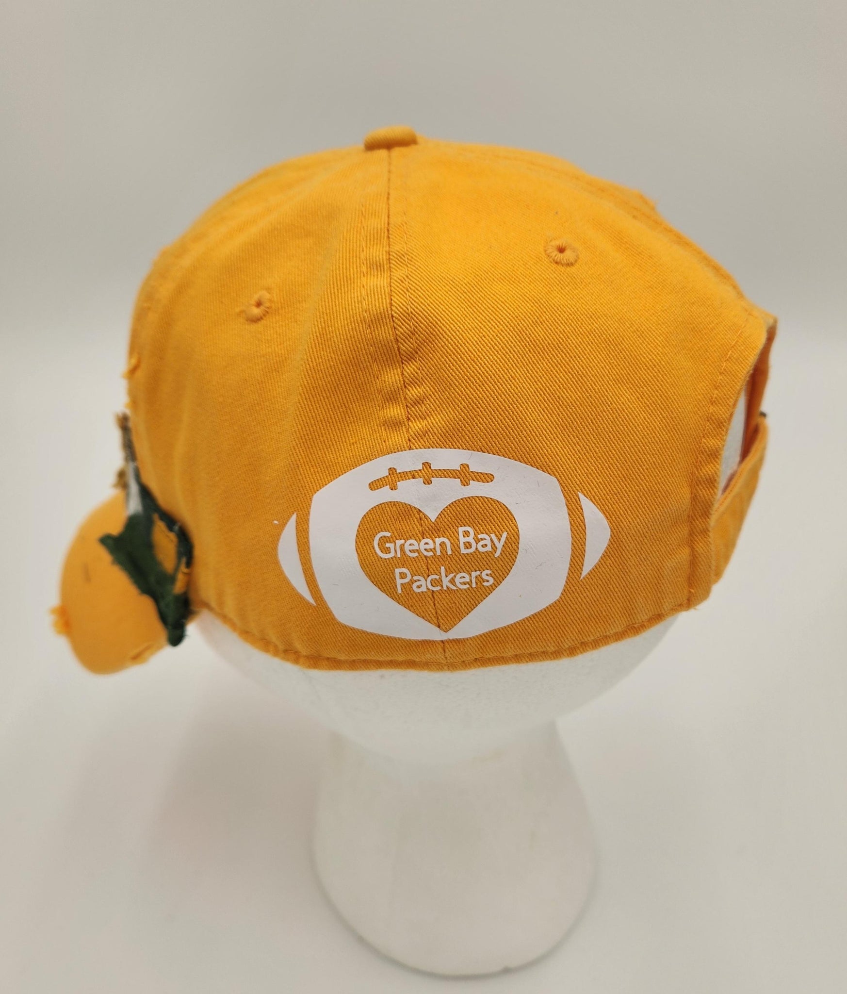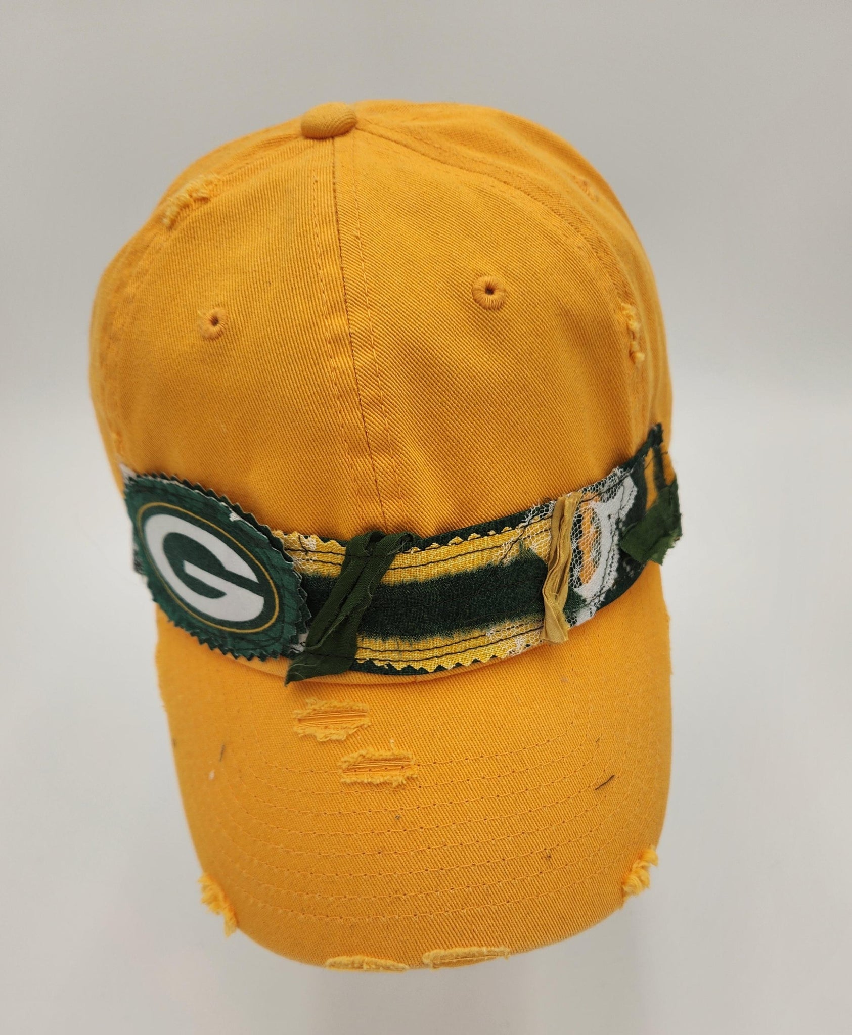 This distressed upcycled/handmade baseball hat is perfect for cheering on our Green Bay Packers! Green, gold, and white make up it's color palette.